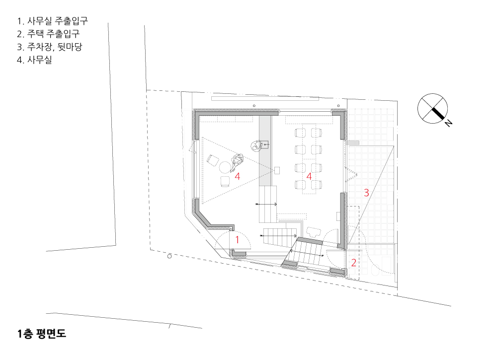 건축주의 사무실로 사용되는 지하층과 1층, 2층은 대지의 높낮이를 이용하여 반층씩 올라가며 공간이 확장되는 스킵플로어 형식을 사용했다. 1층의 공간은 높이가 다른 두 개의 공간이 마치 극장식 카페를 연상시키는 공간이다. 이 공간에서 다시 폴딩창을 통해 뒷마당으로 공간이 연속적으로 흘러간다.