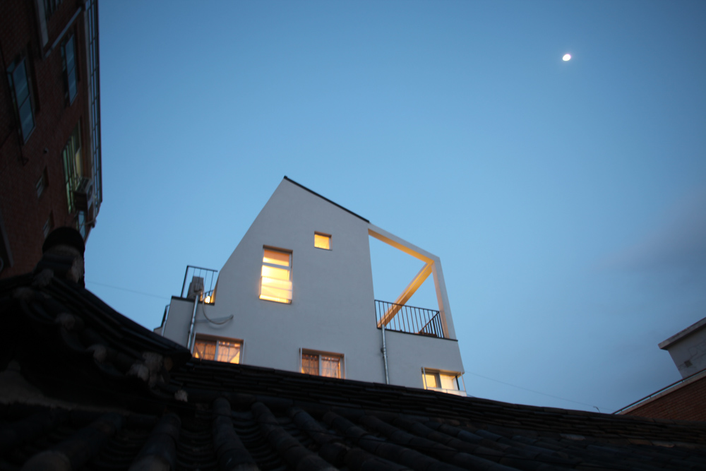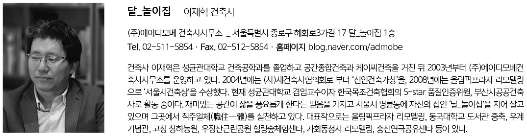 달_놀이집 설계자 | 이재혁 _(주)에이디모베 건축사사무소 건축주 | 이재혁, 홍현경 감리자 | 이재혁 _ (주)에이디모베 건축사사무소 시공사 | 건축주 직영 설계팀 | 이주화, 김재덕, 현진, 장우재 대지위치 | 서울특별시 종로구 명륜1가 주요용도 | 단독주택 + 근린생활시설 대지면적 | 91.97㎡ 건축면적 | 55.10㎡ 연면적 | 192.97㎡ 건폐율 | 59.91% 용적률 | 188.94% 규모 | 지하 1층, 지상 4층 구조 | 철근콘크리트조 외부마감재 | EIFS(스타코 플렉스), 탄화목사이딩, 칼라강판 내부마감재 | 수성페인트, 온돌마루, 콘크리트 면처리, 폴리싱 설계기간 | 2015. 09 ~ 2016. 05 공사기간 | 2016. 05 ~ 2016. 12 사진 | 이재혁 _ admobe architect 전문기술협력 - 구조분야 : (주)허브구조, 김형만 구조기술사 - 기계설비분야 : 유영설비기술연구소 - 전기분야 : 거산ENG |