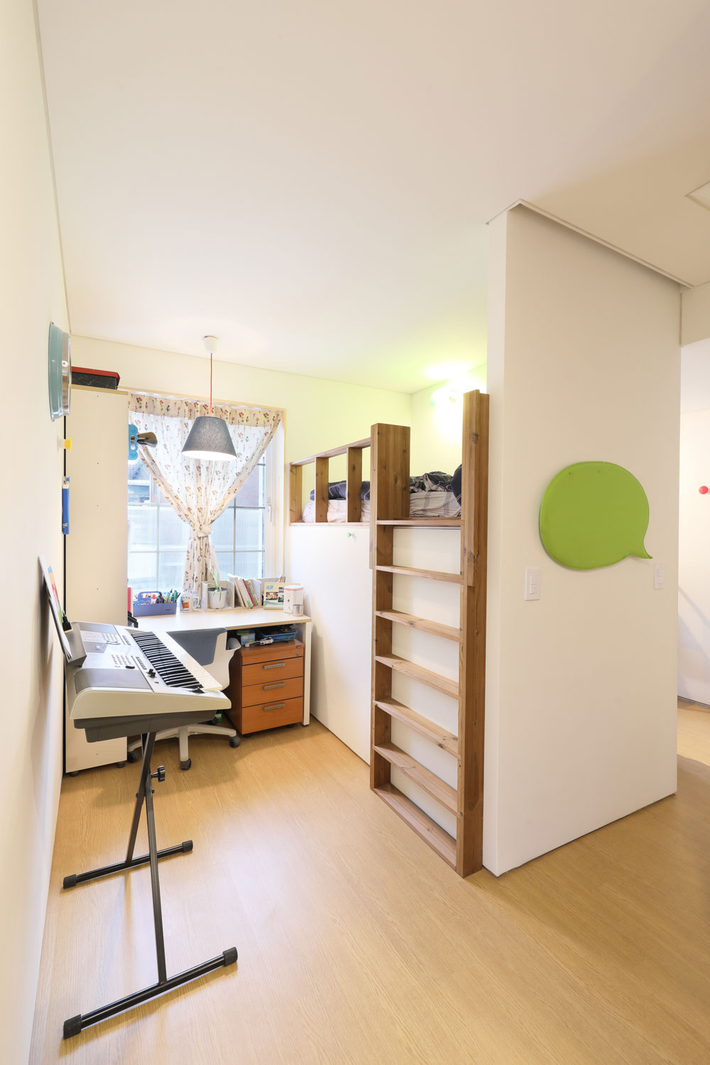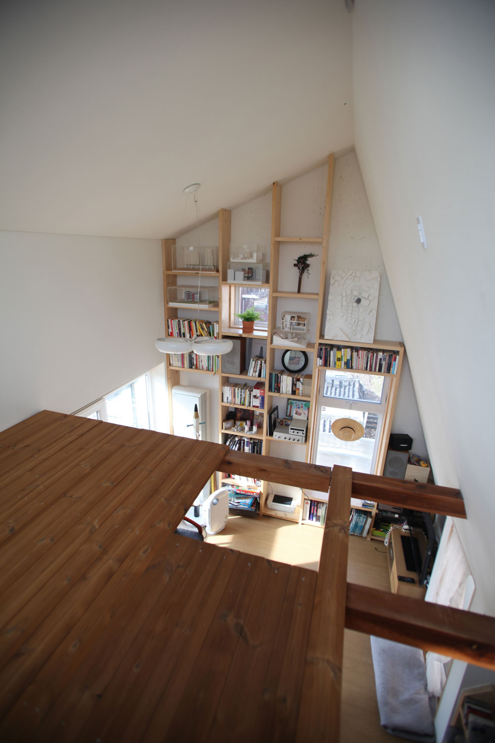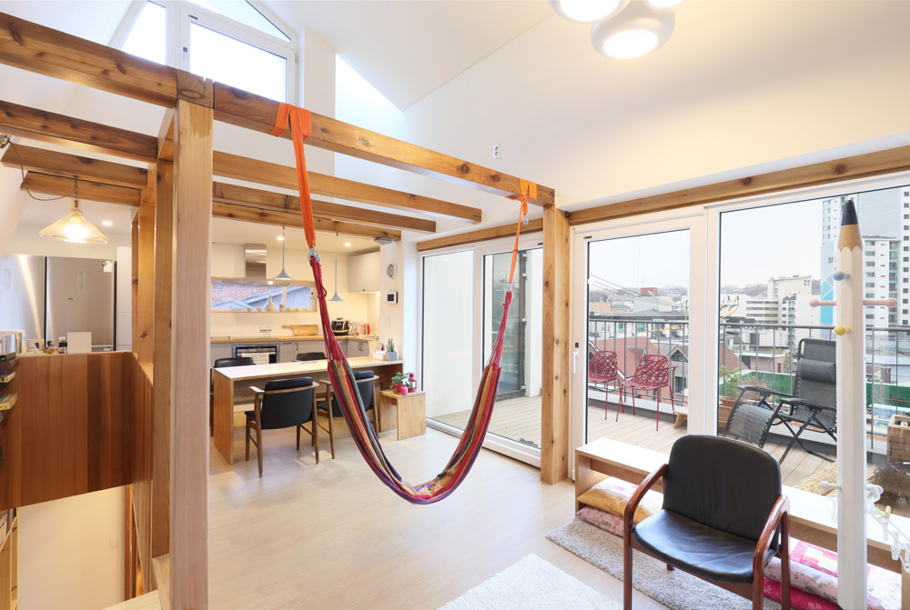 Along with the stairs from the second-floor entrance to the fourth floor of the house, there was a series of ‘family bookshelf’. The bookshelf plays a role not only in capturing the daily activities of the family, such as books, CDs, picture frames, PCs, and playthings but also in spatially enriching and harmoniously integrating the stairs connected to each floor.