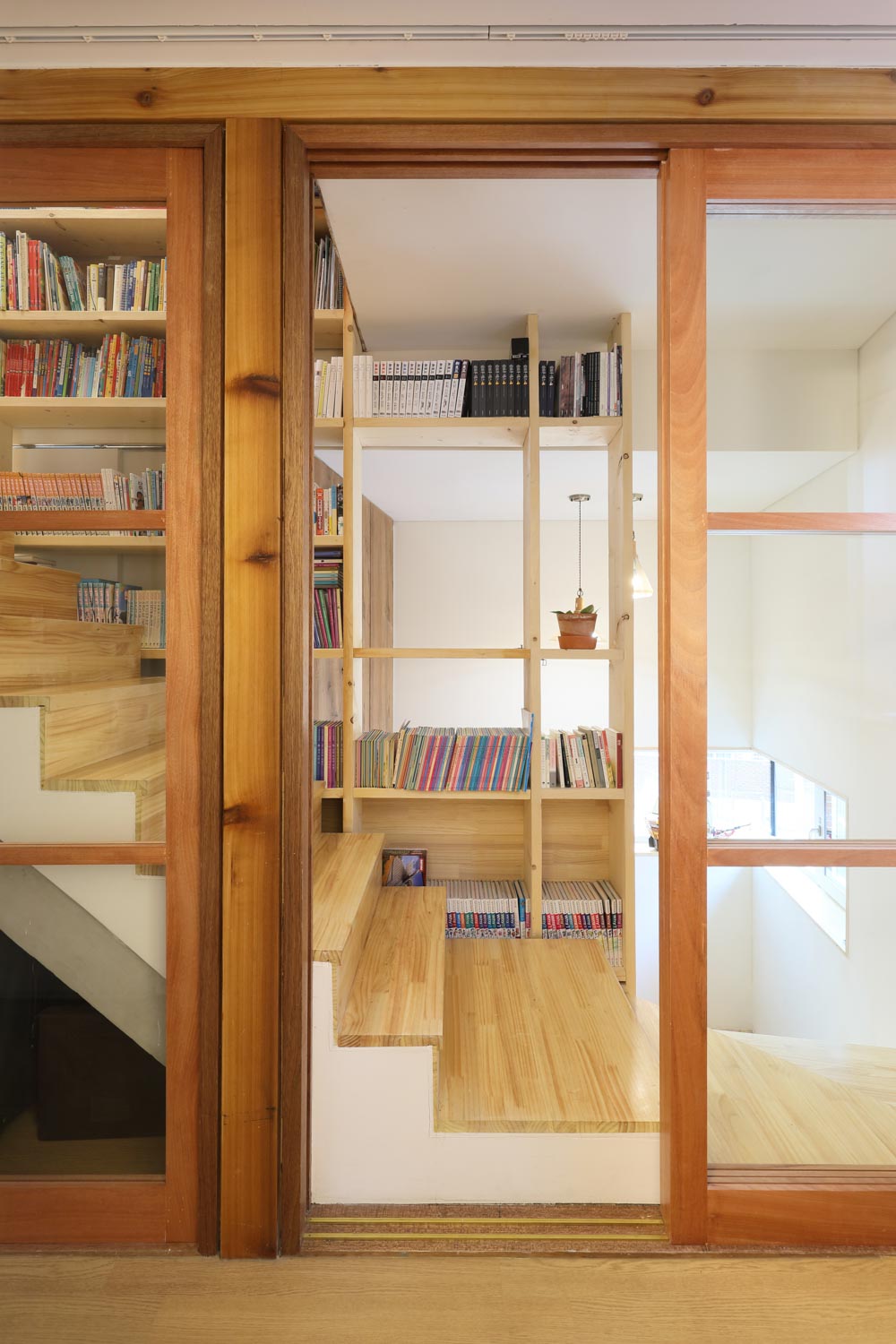 주택의 2층 현관에서 4층에 이르는 계단 측면에는 연속된 ‘가족서가(家族書架)’를 두었다. 이 책꽂이에는 책, CD, 액자, PC, 놀이기구 등 가족의 일상을 담는 역할을 하며 각 층을 연결하는 계단과 어우러져 공간을 풍요롭게 만드는 역할을 한다.