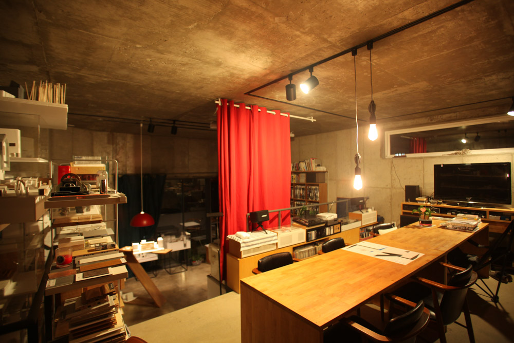 From the basement up to the second floor used as the client's office, we designed a continuous expanding skip floor spaces by halfstory through using the different ground levels. Two split levels on the first floor remind of a theater cafe, from which the backyard is connected through the folding window.