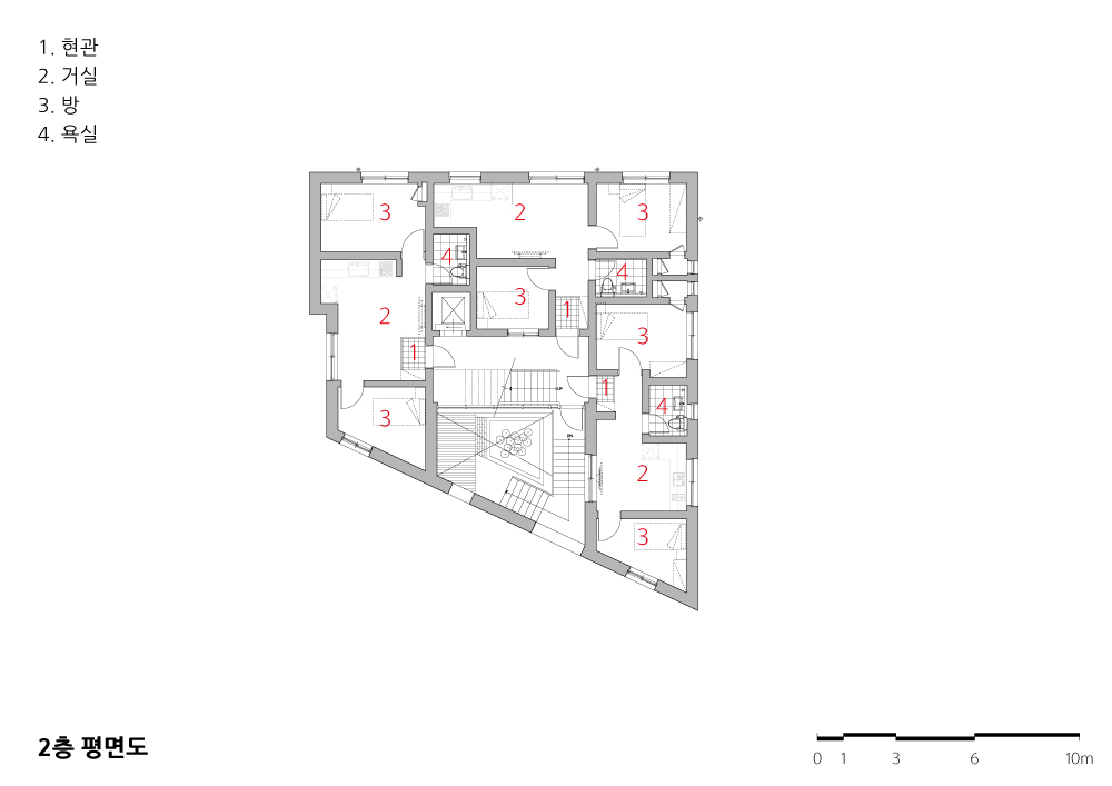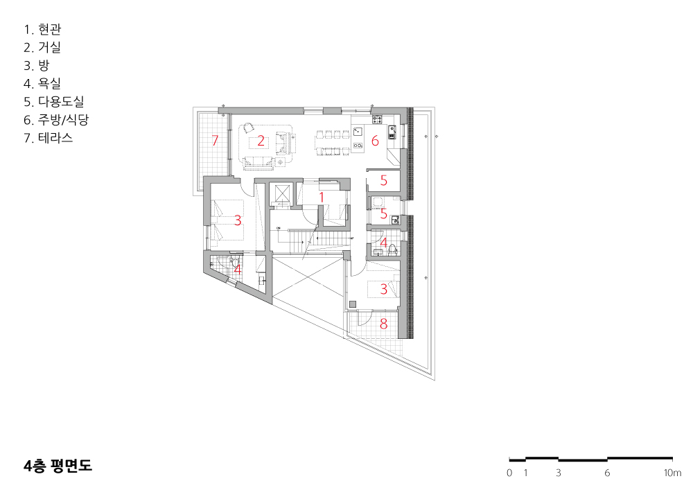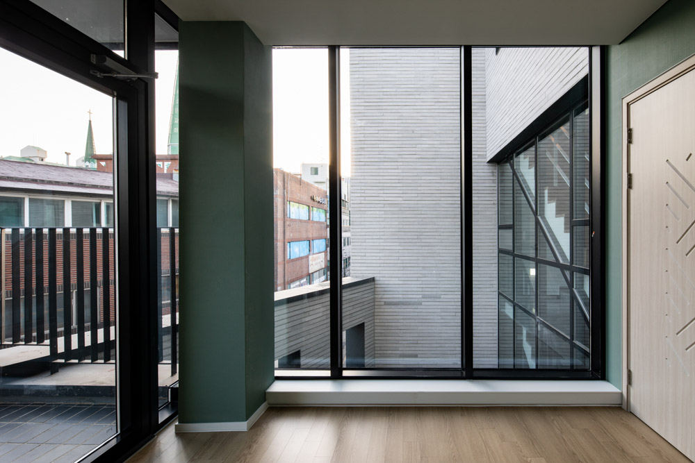 건물의 4층, 5층은 주인주택이다. 부모님과 같이 살아야 하는 자녀 둘을 둔 건축주 부부이다. 부모님 친인척들의 방문이 많고, 일상에서 3대가 식사는 공유하되 서로 독립적인 개별성도 요구되는 프로그램이었다. 우리는 4층은 부모님세대로, 5층은 자녀세대로 구분하면서 선택적 분리 동선이 가능한 현관 공간의 계획으로 3세대 거주에서 중요한 개별성과 공유성을 해결 할 수 있었다. 여기서 현관은 4층 부모님세대, 손님과 아버님이 공유하는 사랑방, 5층 자녀 세대가 분리되면서도 공유하는 전이 공간 같은 장소가 된다. 또한 중정 코어와 이어진 현관을 두면서 각 실들이 ㄷ자 배치로 구성되어 환기와 채광을 확보 할 수 있었다. 특히 4층 사랑방은 테라스와 연계되면서 동네 풍경을 담아내고 있는 특별한 장소가 되고 있다.