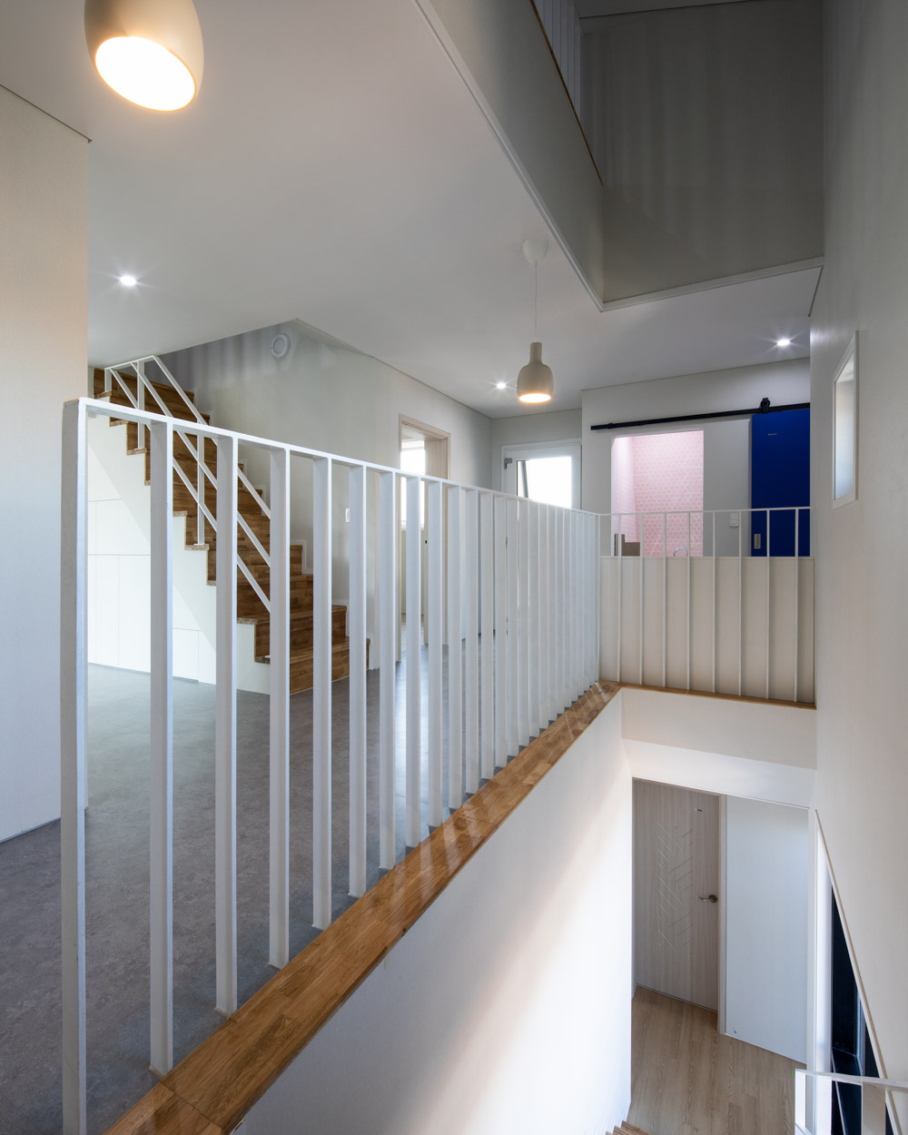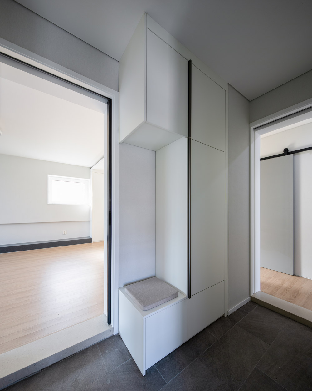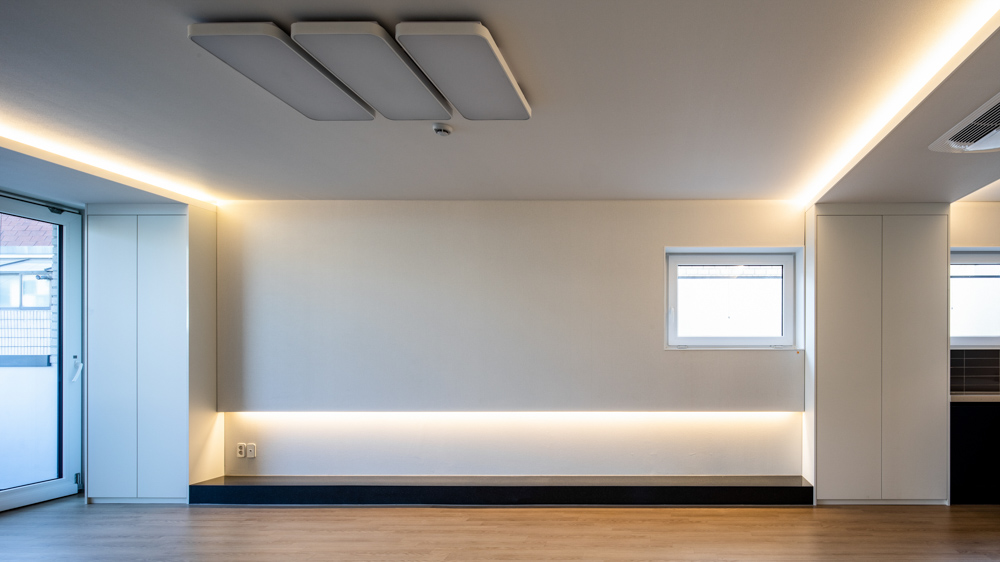 The clients live on the fourth and fifth floor, who are a couple living with their parents and two children. Their parents have relatives to visit often. Normally the entire family eats together although they need independency and privacy when necessary. The client’s parents live on the fourth floor, the children on the fifth floor. Although the generations are separated by floor, independence and sharing could be balanced with carefully designed entrance space which provides ‘sarang-bang’, the reception room, and a transitioning space to the fifth floor. Also, with the entrance connected to the courtyard core, each room has the c-shaped layout to secure ventilation and light. In particular, the fourth-floor reception room is connected to the terrace and becomes a special place that captures the scenery of the neighborhood.