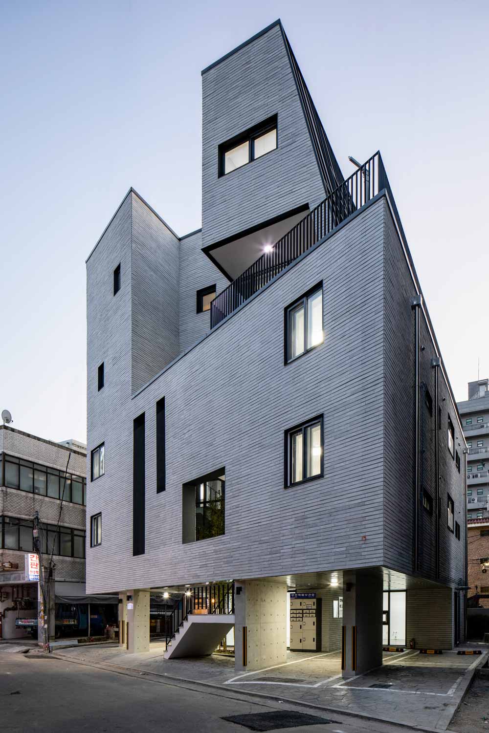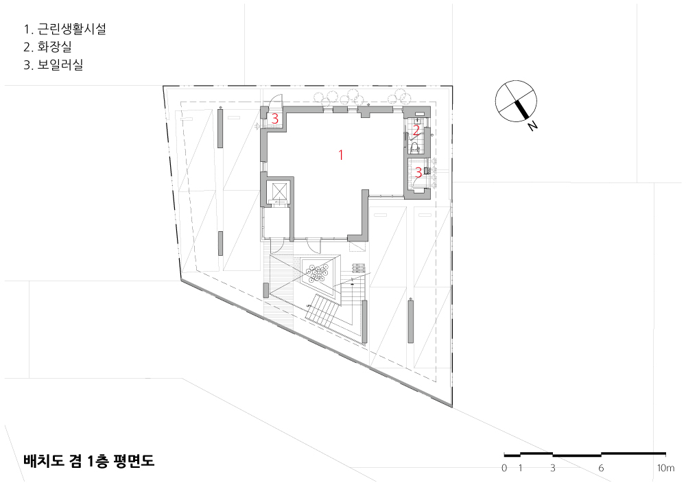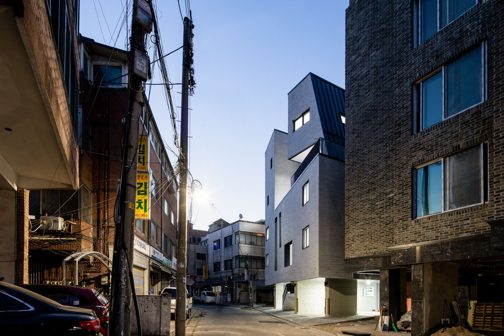 북동쪽에 전면도로를 둔 필지로 남쪽에 상층부 주택 채광과 북쪽에 1층 상가를 두어야 하는 채광과 상가 접근이 다른 방향을 가진 땅이다. 여기서 우리는 ‘어떻게 하면 도시가로와 관계를 가지면서 건물의 진입과 상가의 접근성, 상층부 다세대주택의 남쪽 채광을 해결할 수 있을까?’하는 질문에서 계획을 시작했다.