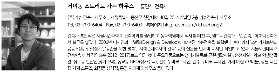 Street Garden House Architect | Hong, Mansik _ RICHUE Architect Client | Kim, Seonghun Supervisor | Kim Yeongdeok _ YEJO URBAN & ARCHITECT Construction | KUNST CONSTRUCTION Project team | Lim, Doyoung Location | 7, Geoma-ro 5-gil, Songpa-gu, Seoul, Korea Program | Housing, Neighbourhood Living Facility Site area | 274.50㎡ Building area | 162.82㎡ Gross floor area | 547.76㎡ Building to land ratio | 59.32% Floor area ratio | 199.55% Building scope | 5F Structure | RC Exterior finishing | Brick tile Interior finishing | Wood floor, Wall paper Design period | Jul. 2017 ~ Apr. 2018 Construction period | Apr. 2018 ~ Jan. 2019 Photograph | Lee, Hanul _ Narsilion Photography Structural engineer | Gwangrim structure Mechanical engineer | Codam enginering Electrical engineer | Codam enginering Fire engineer | Codam enginering |
