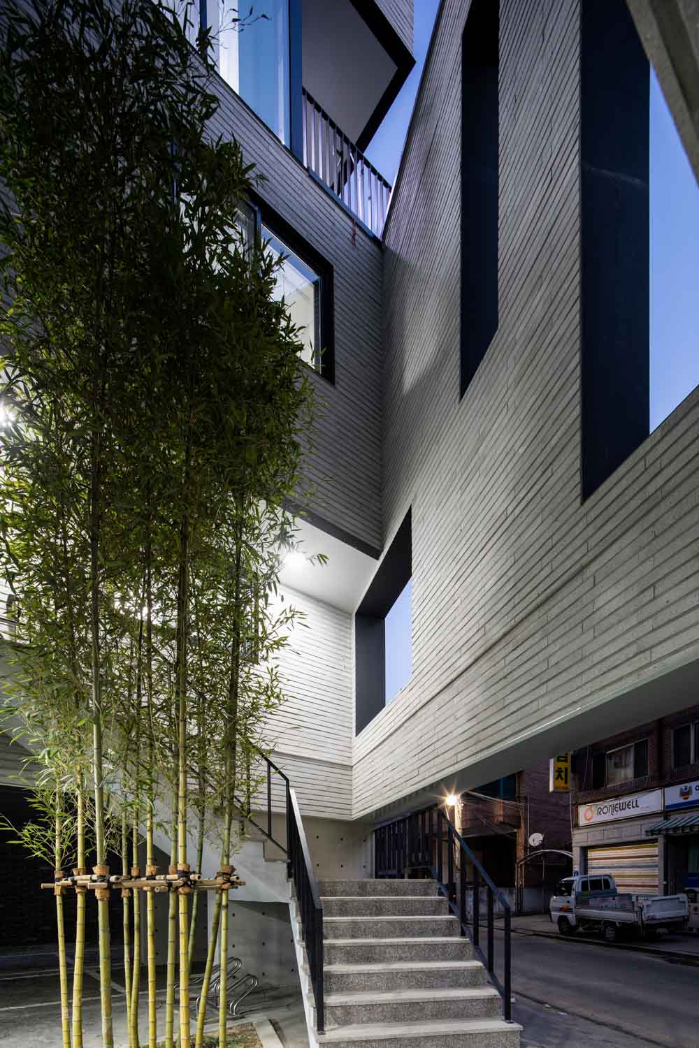 우리는 가로마당을 중심으로 ㄷ자 배치로 계획하면서 수직 중정을 끼고 오르내리는 중정코어의 방식으로 주거세대들을 구성했다. 진입에서부터 계단은 일반적인 돌음 계단실이 아니라 중정을 끼고 올라가 2층에서 로비 홀을 만나는 외부형 계단으로 오르내린다. 중정 코어는 비워진 수직 보이드, 대나무 식재, 복도, 계단이 주변 동네 풍경과 서로 중첩되면서 공유되는 도시적 공간으로 경험하게 된다. 이러한 중정 코어의 수직적 동선은 계단의 단순한 동선적 기능을 넘어 상호 교류적 공간 경험을 만들면서 건물 사용자들의 커뮤니티를 형성하는 장소가 된다.