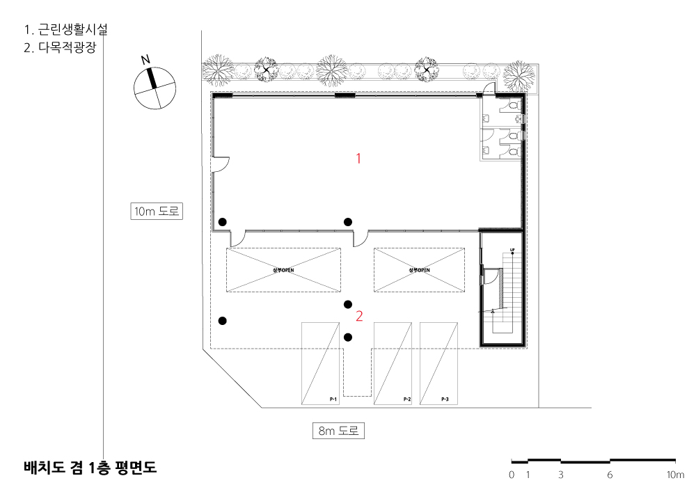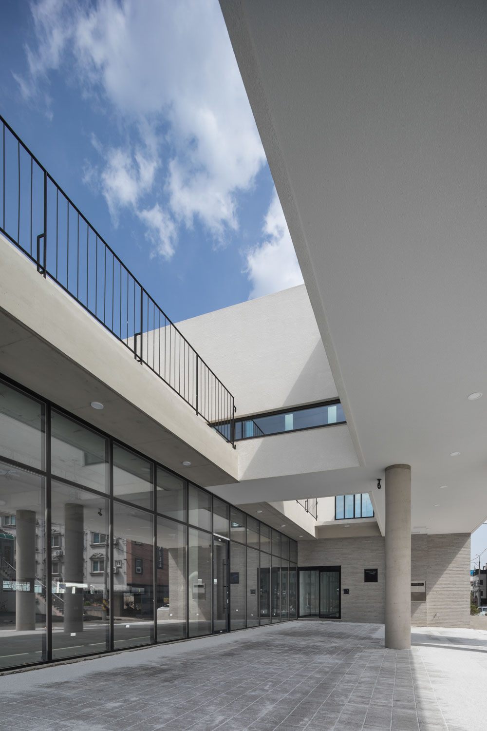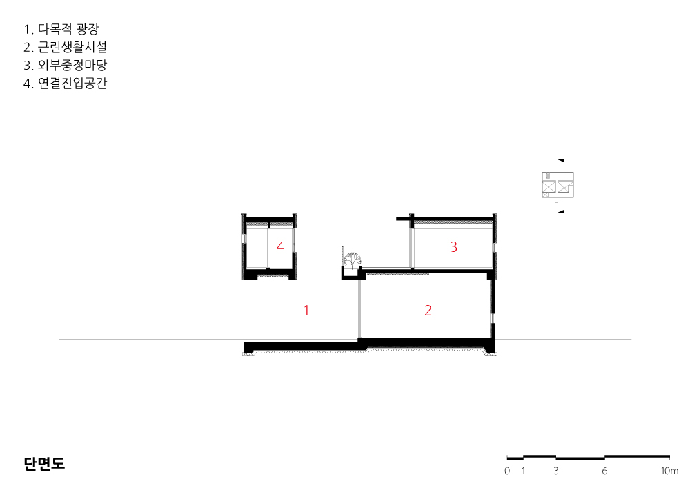 공적인 유틸리티와 자녀가 방문 했을 때 사용하는 게스트룸을 도로쪽 매스로 분리하고 부모님이 생활하는 공간을 도로 반대편 매스에 기능적으로 담아냈다. 이를 연결하는 연결복도를 통하여 외부 중정 마당 영역을 다시 이원화 했다. 서로 다른 성격의 중정마당은 1층의 상가 이용자들과 주변의 다가구들로부터 사생활을 보호하는 장치가 되기도 한다. 농작물을 가꾸고 장문화를 유지하고 있는 부모님 세대에는 이 기능이 해결 될 수 있는 옛날 마당과 같은 공간이 필요하기 마련이다. 연결 복도를 통한 동선이 남쪽 도로로 돌출된 외부 테라스를 통하여 공간적 확장을 가져온다. 또한, 이 돌출 테라스는 주변의 건축물로 구성된 도시와 소통적 관계를 설정한다. 1층의 상가 앞에는 코너 대지의 특성을 반영하여 광장적 성격을 가진 큰 광장 마당을 두었다. 이는 상가의 다목적 공간으로 활용될 것이며, 근교 도시의 여유를 가져다 줄 상가 이용객들과의 새로운 소통적 관계를 만들어줄 것이다. 1층 광장마당과 2층의 서로 다른 두 개의 중정 마당은 외부적 연결 관계를 형성한다. 이 건축물이 도시 근교의 건축물에 대한 가능성을 제시해 주변의 변화를 이끌어 가기를 기대한다.