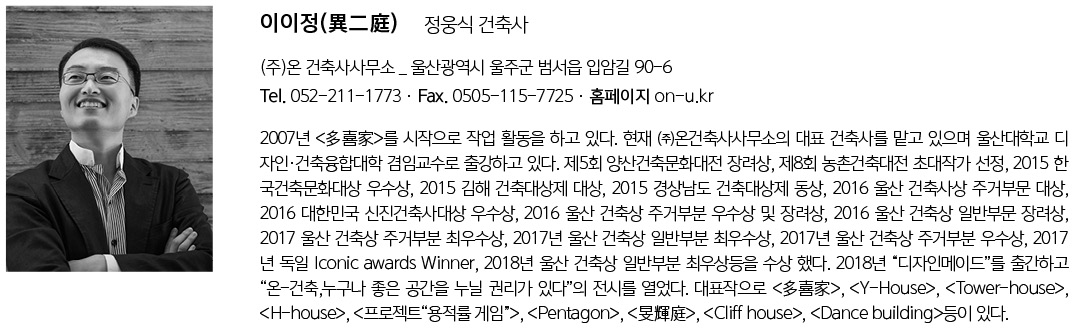 이이정(異二庭) 설계자 | 정웅식 _(주)온 건축사사무소 건축주 | 신명수 감리자 | (주)가나 건축사사무소 시공사 | 신명수 설계팀 | 김남수, 김혁기, 김민성, 정수지, 김영주 대지위치 | 울산광역시 울주군 삼남면 교동리 주요용도 | 제1종근린생활시설, 단독주택 대지면적 | 422.00㎡ 건축면적 | 249.27㎡ 연면적 | 334.39㎡ 건폐율 | 59.07% 용적률 | 79.24% 규모 | 지상 2층 구조 | 철근콘크리트조 외부마감재 | 스타코, 모노타일 브릭 내부마감재 | 실크벽지, 적삼목 설계기간 | 2017. 02 ~ 2017. 08 공사기간 | 2017. 09 ~ 2018. 05 사진 | 윤준환 전문기술협력 - 구조분야 : (주)제네랄구조엔지니어링 - 기계설비분야 : (주)금강디엔에스 - 전기분야 :(주)금강디엔에스 |