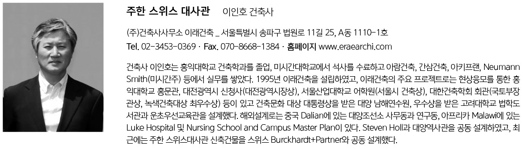 | 주한 스위스 대사관 설계자 이인호_ (주)건축사사무소 이래건축· Nicolas Vaucher_Daniel Pantillon_Burckhardt+Partner SA, Swiss 건축주 | 스위스국, Jodok Brunner, Cedric Pernet 감리자 | 정민희 _ (주)건축사사무소 이래건축 시공사 | (주)이안알앤씨 대지위치 | 서울특별시 종로구 송월길 77 주요용도 | 외국공관 대지면적 | 2,377.30㎡ 건축면적 | 983.30㎡ 연면적 | 2,895.94㎡ 건폐율 | 41.36% 용적률 | 103.75% 규모 | 지상 3층 구조 | 철근콘크리트조 + 목구조 외부마감재 | - 건물 외벽 : 적삼목 무늬 노출콘크리트, 알루미늄+오크목 창문 - 중정 : 목재창 및 도어(Acoya Wood), 3중유리(45mm, 저철분 투명유리) - 지붕 : 알루미늄 ZINC(미국 수입품) 두께 0.7mm 내부마감재 | - 벽 : 석고보드 위 친환경페인트 - 천장 : 3 Layer Board를 콘크리트 거푸집과 천장마감재로 사용 - 바닥 : White Oak Wood 온돌마루 설계기간 | 2013. 07 ~ 2016. 06 공사기간 | 2017. 01 ~ 2018. 10 사진 | Hélène Binet, 이인호 전문기술협력 - 구조분야 : INGENI / SQ엔지니어링(주) - 기계설비분야 : PLANAIR / (주)노스타엔지니어링 - 전기·통신분야 : Christian Risse / (주)전기설계·협인 |