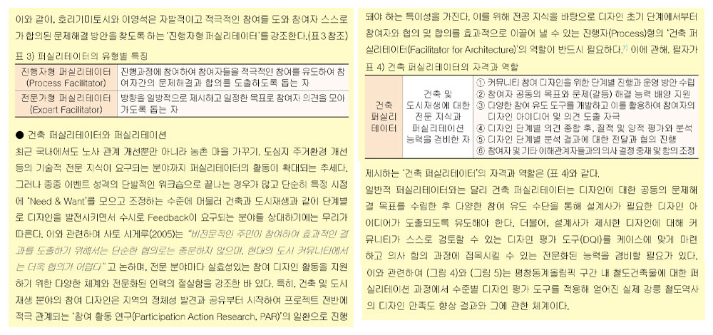 그렇다면 우리나라의 현실에서 ‘건축 퍼실리테이터’의 역할은 무엇일지 살펴보자. 퍼실리테이터와 건축 퍼실리테이터에 대한 분명한 이해를 위해 퍼실리테이터이며 필자와 건축 퍼실리테이팅 작업을 수차례 진행한 바 있는 ‘박남용 교수의 글’을 소개한다.