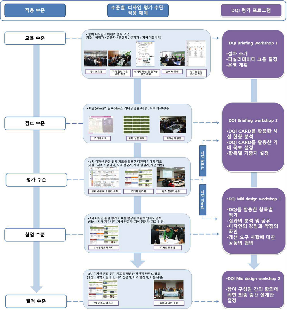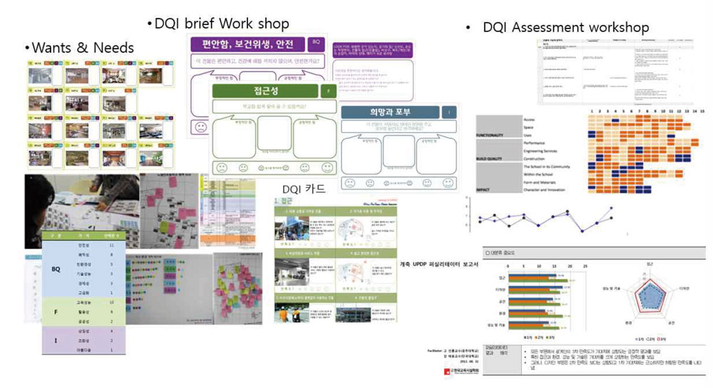 대부분 건축 비전공자이며 다양한 요구와 사회적 정체성을 지닌 참여자들을 모아서 지어질 시설(사업)에 대해 이야기하고 그것을 다시 건축적 언어로 번역해 내는 과정을 거친다. 이와 함께 공감을 통해 공유된 기준으로 주어진 평가지표항목을 참여자들이 판단한 가치로 가중치를 정하고 중요도를 조절해 나가는 과정으로 진행된다. 이 과정은 매우 복잡하며 DQI의 통계적 방법을 사용하지만 동시에 이를 이끄는 건축 퍼실리테이터의 능력에 따라 성패가 좌우될 수 있어 건축 퍼실리테이터에 대한 체계적인 교육을 진행하며 그 자격을 관리하고 있다.