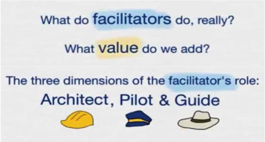 퍼실리테이터는 ‘조력자’ 정도로 번역할 수 있다. 일반적으로 퍼실리테이터가 담당해야 할 일을 퍼실리테이터교육기관인 IIFAC(International Institute for Facilitation and Change)의 교육 자료에서 찾아보면 크게 세 가지로 쉽게 설명하고 있다. 첫째, 요구를 받아 기획하고 적절한 재료(주제들)로 구축하는 ‘건축사’의 역할, 둘째, 구축된 회의를 준비하고 이끌어 항로를 찾아가는 ‘항공기장’의 역할, 마지막으로 새로운 영역으로 사람들을 이끌어 안전하게 탐험하고 도전하게 하는 ‘여행안내자’의 역할로 설명하고 있다. 물론 비유이지만 건축사가 지니는 기본적인 역량이 이미 포함되어 있다는 것만으로도 건축사가 퍼실리테이션에 적합한 능력을 상당부분 갖추고 있다고 할 수 있다. 더구나 여러 단계의 회의와 워크숍을 이끌어가는 퍼실리테이션과 건축물을 설계하고 건설하는 과정에서 이루어지는 건축 퍼실리테이션에는 차이가 있기 때문에 건축사의 고유한 능력을 발휘 할 수도 있다.