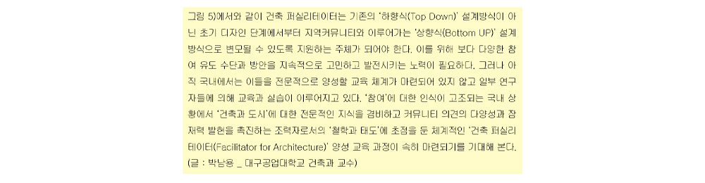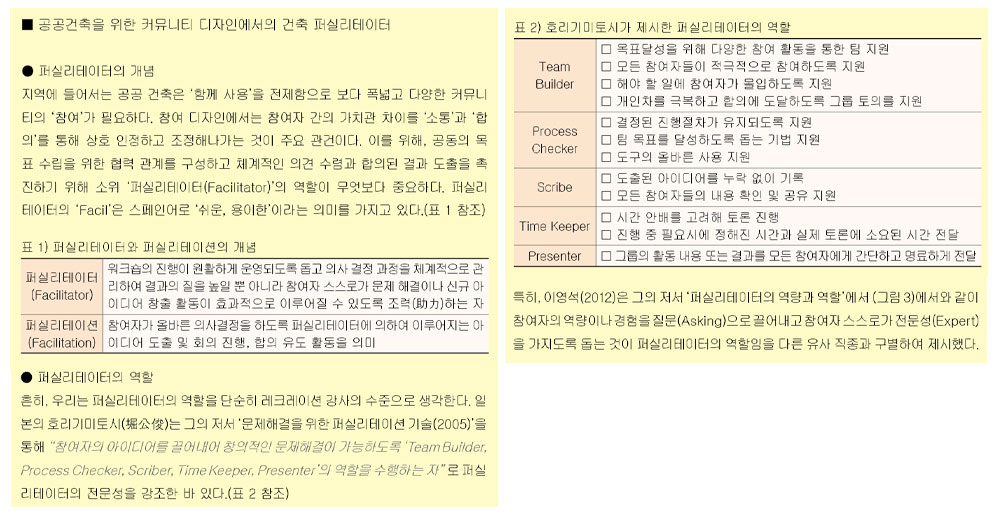 그렇다면 우리나라의 현실에서 ‘건축 퍼실리테이터’의 역할은 무엇일지 살펴보자. 퍼실리테이터와 건축 퍼실리테이터에 대한 분명한 이해를 위해 퍼실리테이터이며 필자와 건축 퍼실리테이팅 작업을 수차례 진행한 바 있는 ‘박남용 교수의 글’을 소개한다.