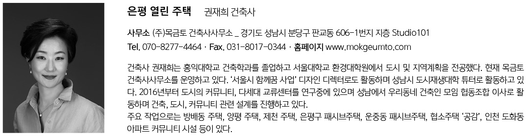 | 은평 열린 주택 설계자 | 권재희_(주)목금토 건축사사무소 건축주 | 박성준, 김윤정 감리자 | 권재희 _ (주)목금토건축사사무소 시공사 | (주)선이인터내셔날 설계팀 | 김회준 대지위치 | 서울특별시 은평구 연서로48길 36(진관동) 주요용도 | 단독주택 대지면적 | 330.00㎡ 건축면적 | 153.11㎡ 연면적 | 339.18㎡ 건폐율 | 46.40% 용적률 | 72.77% 규모 | 지하 1층, 지상 2층 구조 | 철근콘크리트조 외부마감재 | 벽돌타일, 강판 내부마감재 | 페인트, 포세린타일 설계기간 | 2016. 12 ~ 2017. 06 공사기간 | 2018. 03 ~ 2019. 03 사진 | 신경섭 전문기술협력 - 구조분야 : SDM 구조기술사사무소 - 기계설비분야 : 수호 엔지니어링 - 전기분야 : 수호 엔지니어링 - 소방분야 : 수호 엔지니어링 |