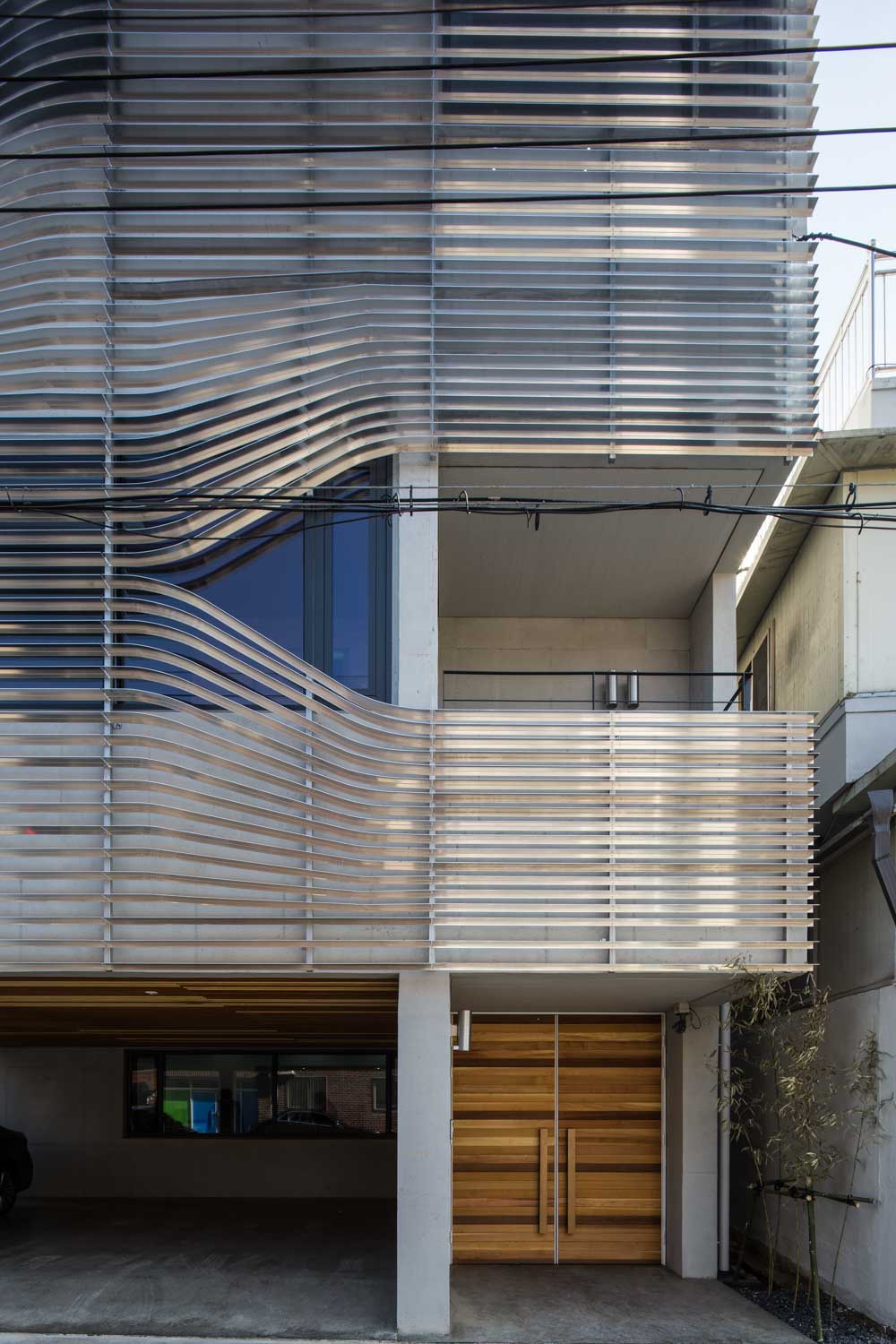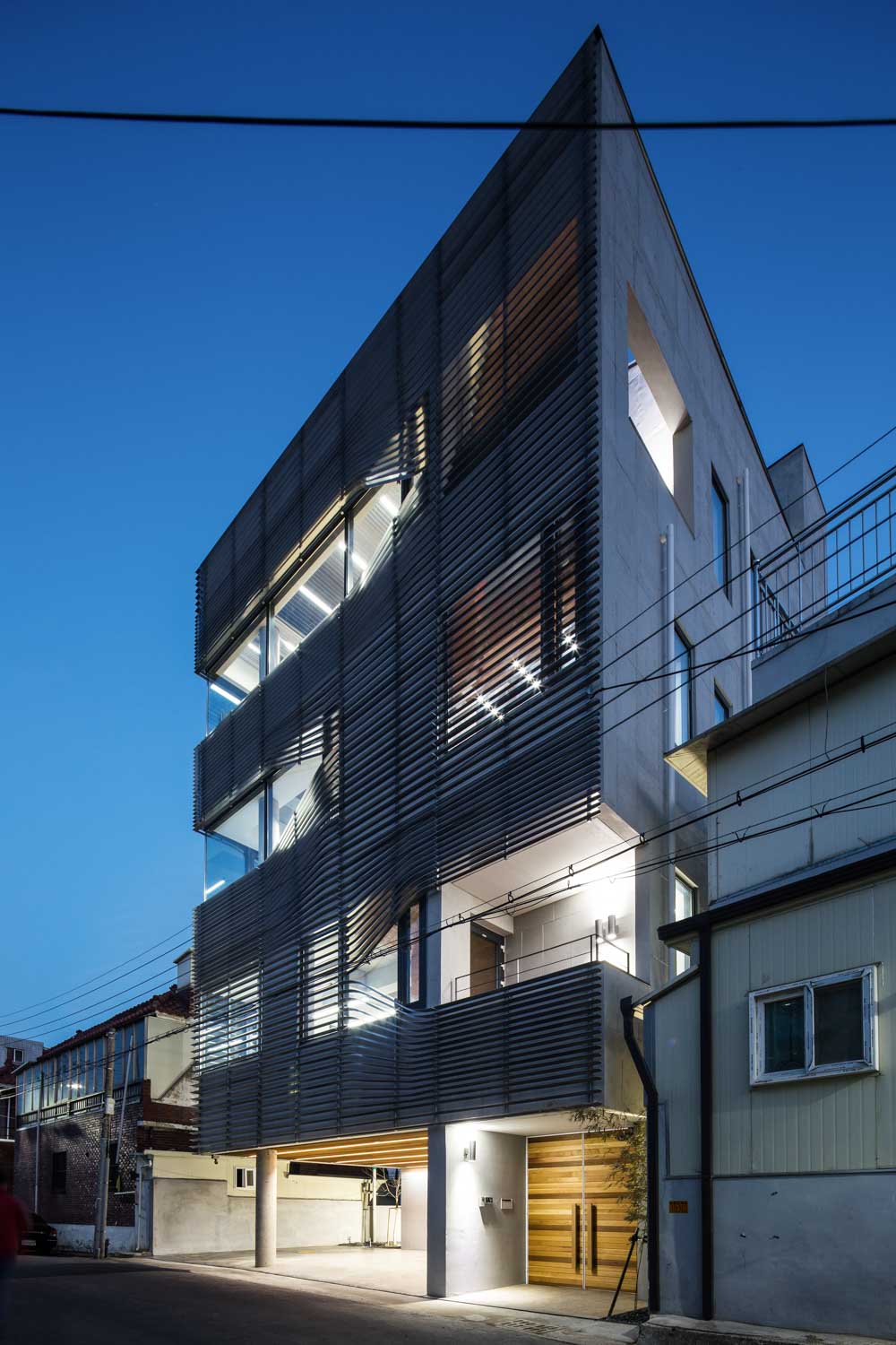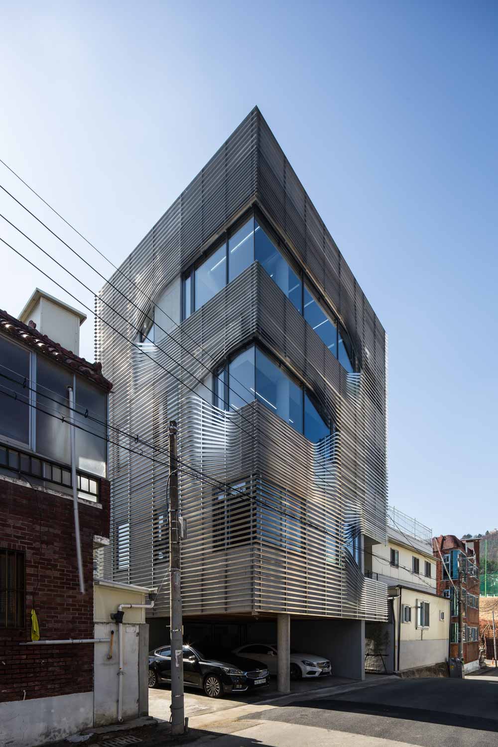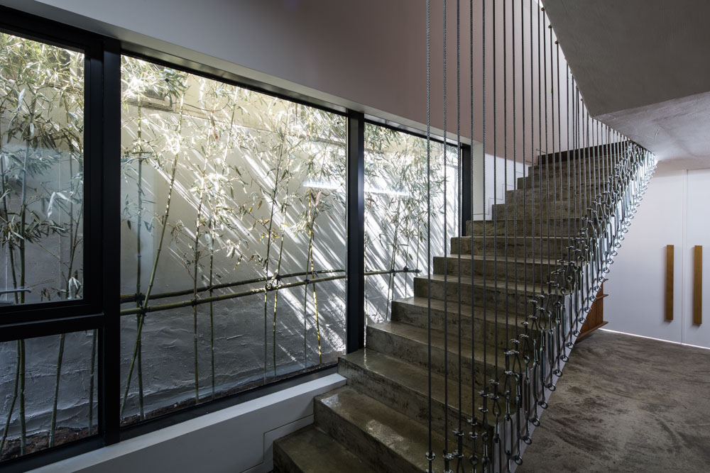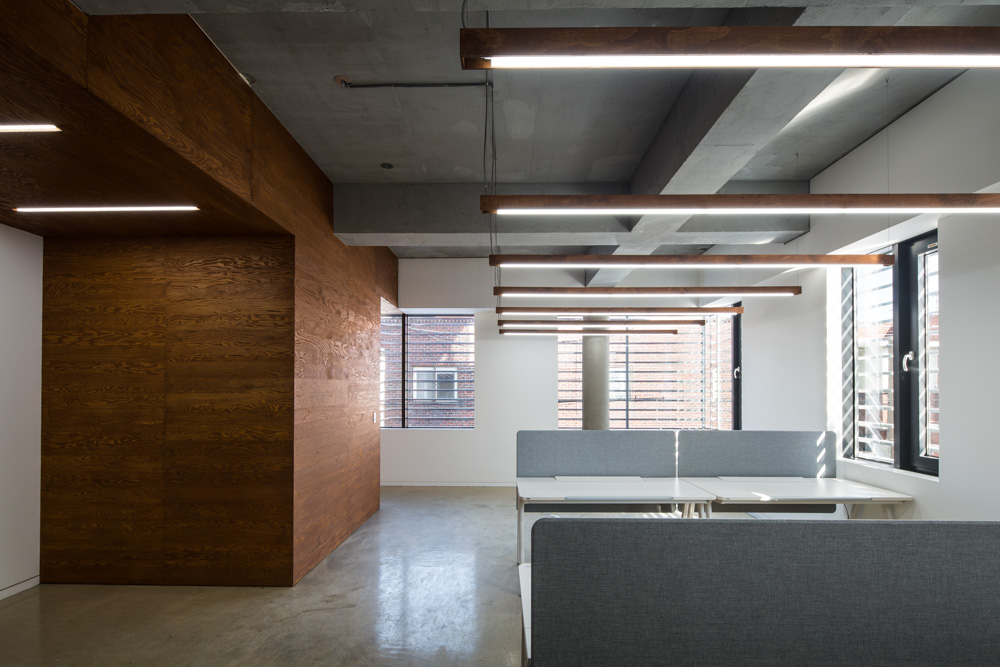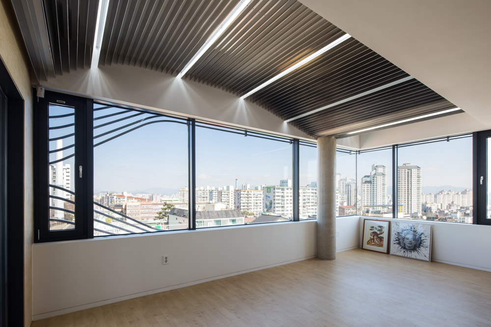 The programs on each floor consist of offices on the first to third floors, and CEO’s office on the fourth floor. Some spaces on the 2nd and 4th floors have terraces to provide communication with the outside. Considering the residential area, an additional aluminum louver was installed on the exterior surface finished with exposed concrete. Aluminum louver becomes corporate identity and secures the privacy of indoor office space. In addition, the 3rd and 4th floors secured a view by bending aluminum louver. The wire railing, which is installed with stairs, creates a different atmosphere in an ordinary staircase.