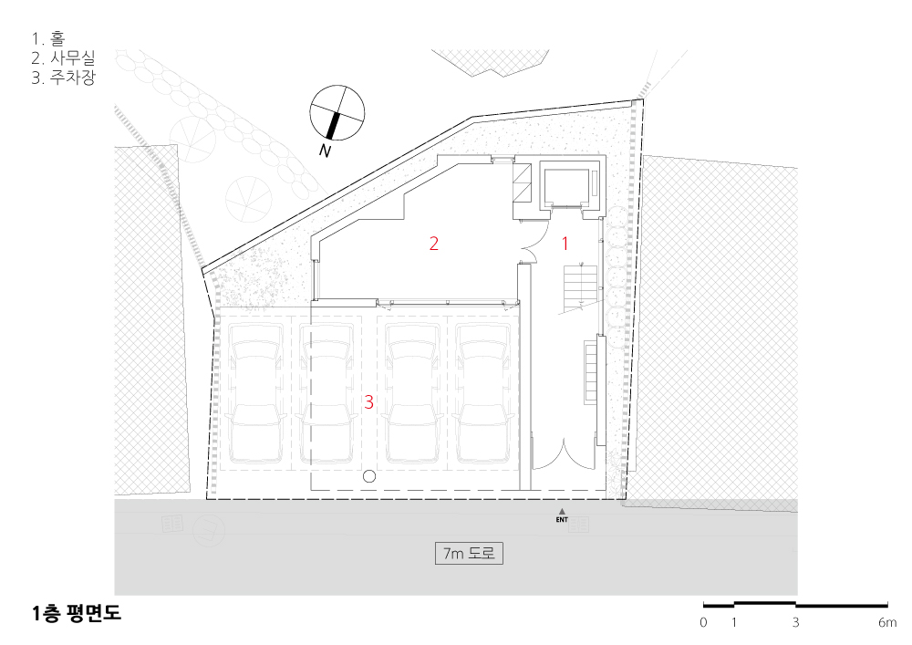 각 진입부(주출입구, 주차출입구)는 도로의 레벨차를 고려하여 자연스럽게 내부와 연결되도록 했다. 주출입구와 계단실(계단,엘리베이터)은 대지형상과 정북일조 그리고 도로레벨을 따라 최적의 위치로 결정됐다.