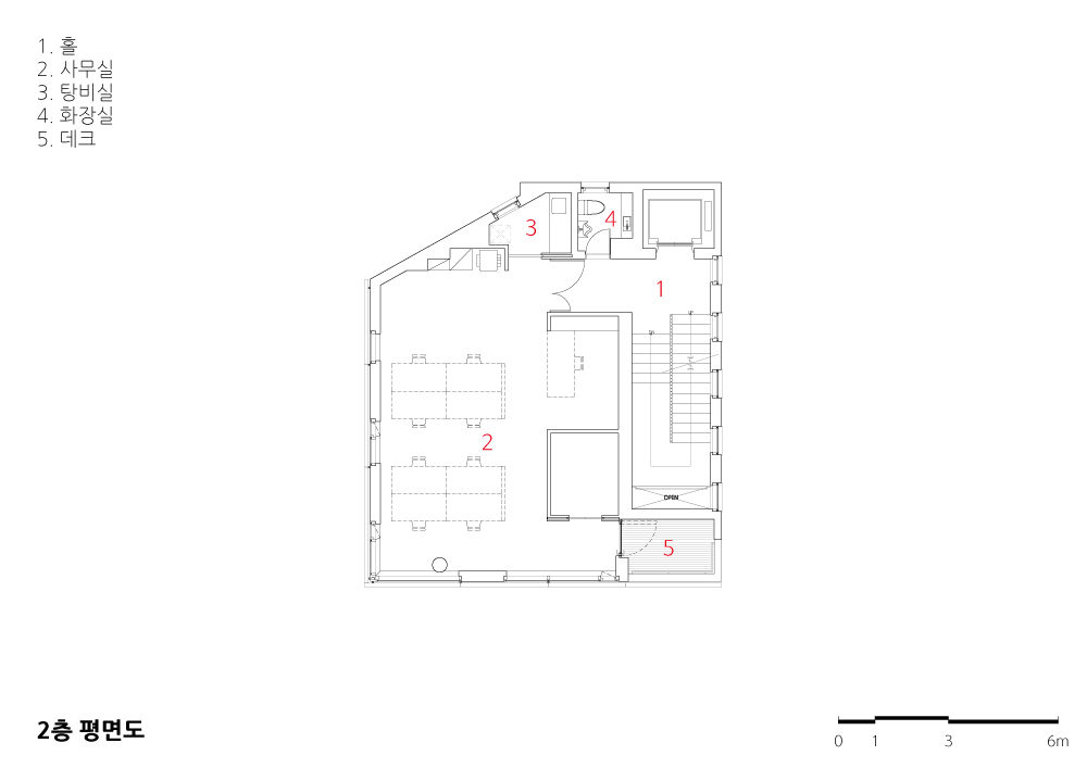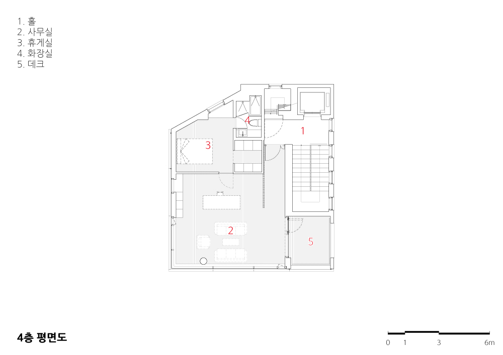 각 층별 프로그램으로 1∼3층은 사무실로, 4층은 대표의 집무실로 구성되어 있다. 2층과 4층 일부공간은 테라스를 배치하여 외부와 소통하는 공간을 마련했다. 주거지역임을 감안하여 노출콘크리트로 마감된 외부면에 알루미늄루버를 추가로 설치했다. 알루미늄루버는 기업의 아이덴티티가 됨과 동시에, 내부사무공간의 프라이버시를 확보하게 된다. 더욱이 3, 4층의 경우에는 알루미늄루버를 밴딩하여 전망을 확보했다. 계단과 함께 설치되는 와이어 난간은 평범할 수 있는 계단실에 색다른 분위기를 만든다.