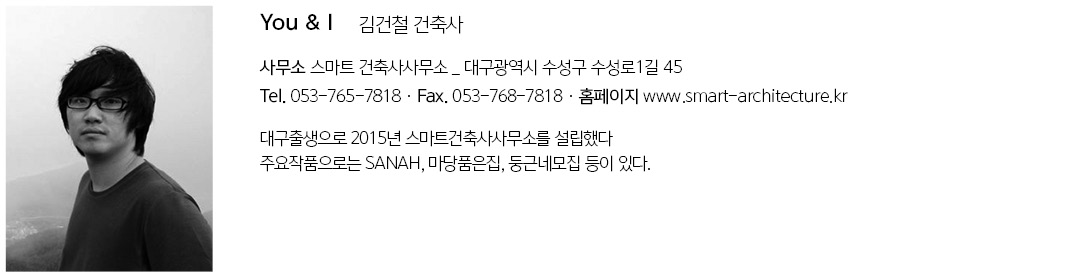 YOU & I Architect | Kim, Guncheol_SMART Architecture Client | YOU&I Supervisor | Kim, Guncheol _ SMART Architecture Construction | Direct undertaking work Project team | Lee, Seungeun Location | Bongdeok-dong, Nam-gu, Daegu, Korea Program | Neighbourhood living facility Site area | 158.00㎡ Building area | 94.54㎡ Gross floor area | 315.57㎡ Building to land ratio | 59.84% Floor area ratio | 199.99% Building scope | 4F Structure | RC Interior finishing | Exposed Concrete Design period | Nov. 2016 ~ Apr. 2017 Construction period | Apr. 2017 ~ Jan. 2018 Photograph | Yoon, Dongkyu Structural engineer | Kangguzo Mechanical engineer | Hankukkiyoun Electrical engineer | Woojin eng Fire engineer | Woojin eng |