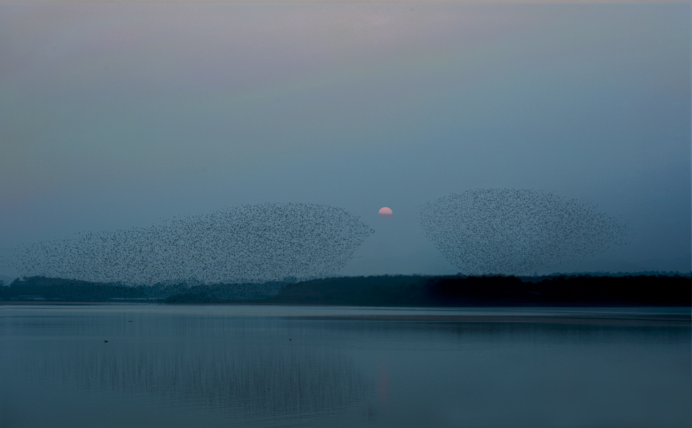 한겨울 동림저수지의 하늘이 석양으로 물들기 시작하면 호수 한가운데 마치 섬처럼 조용히 떠 있던 가창 오리들이 움직이기 시작한다. 낮에는 호수에서 쉬다가 밤에 먹이 활동을 시작하는 가창 오리가 먹이터로 날아가기 위한 준비를 하는 것이다. 처음엔 작은 무리들이 하늘을 돌기 시작하다가 결국엔 수십만 마리 전 개체가 비행에 참여한다. 호수 한가운데서 노을을 배경으로 다양한 모양을 연출하며 상승과 하강, 집합과 분산을 반복하며 비행하는 가창 오리의 군무는 맹렬하게 불어 일어나는 바람의 소용돌이 용오름과도 같다. 수 만 마리 가창 오리가 수면에서 저녁 하늘 위로 올라 장관을 이룬다.