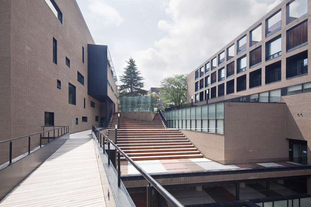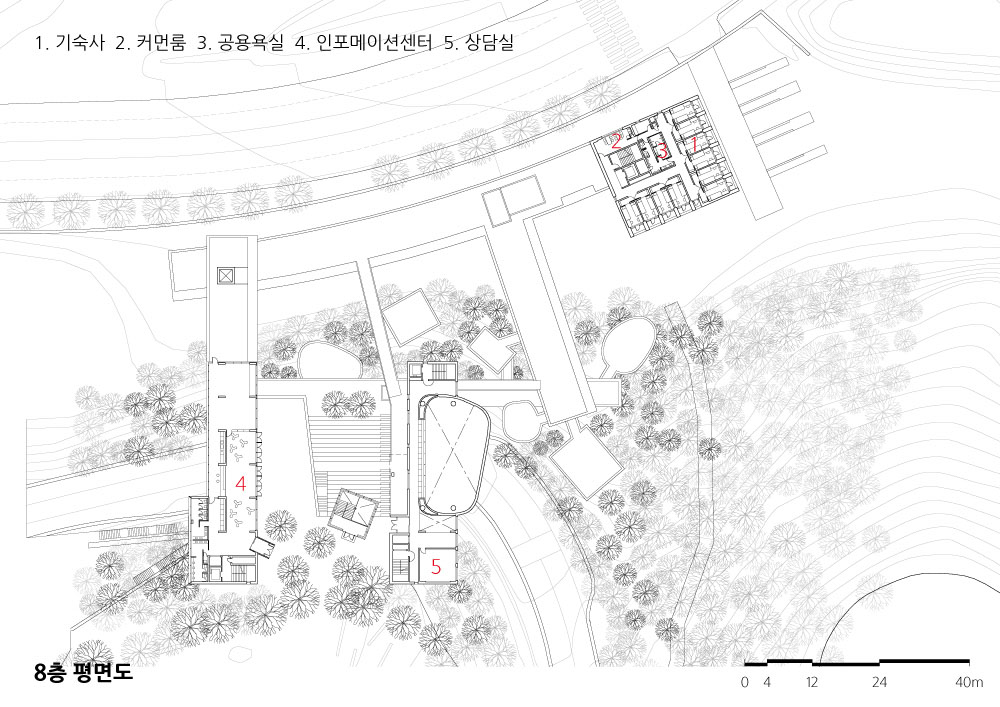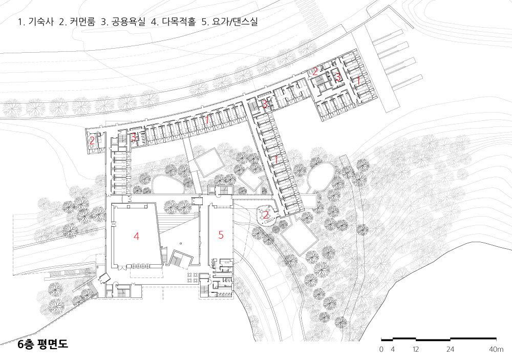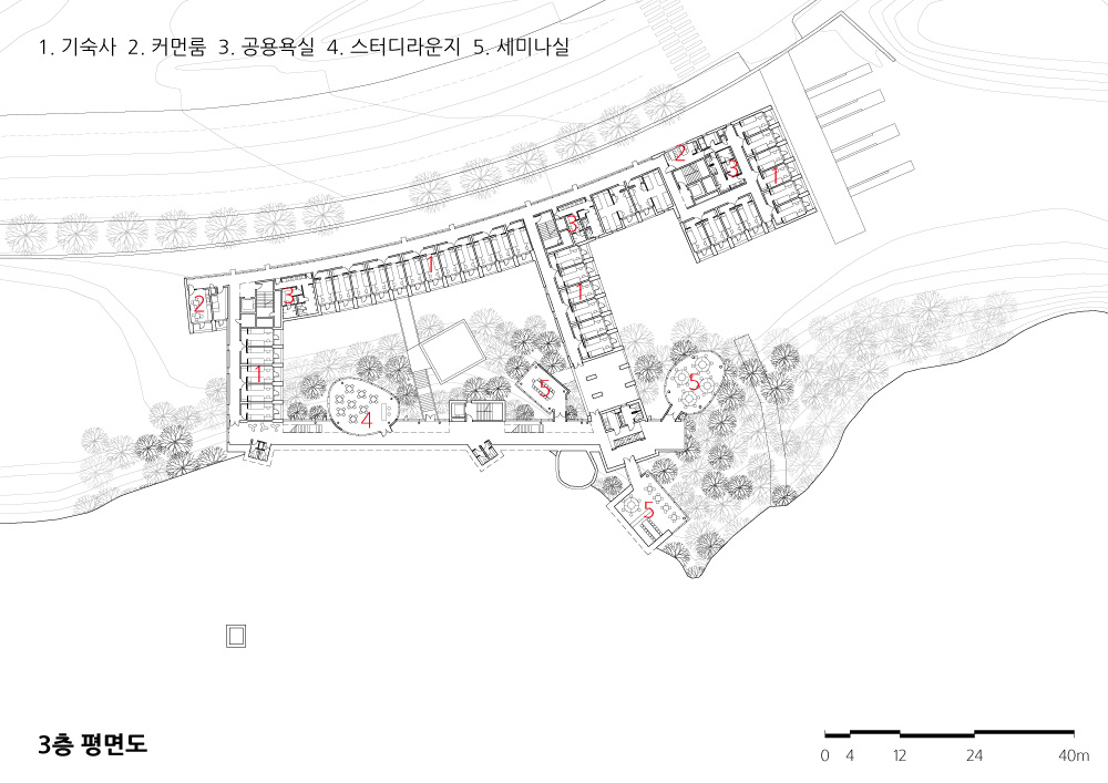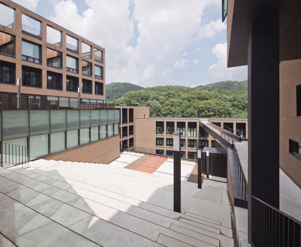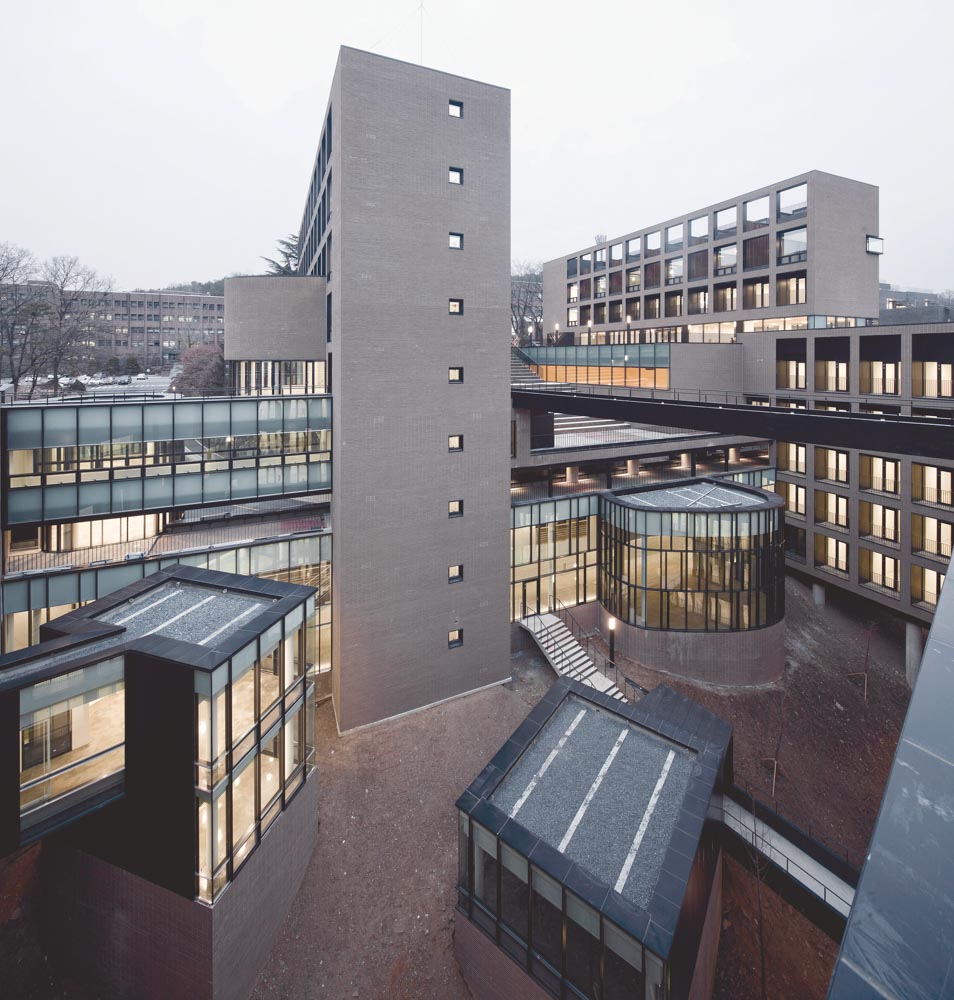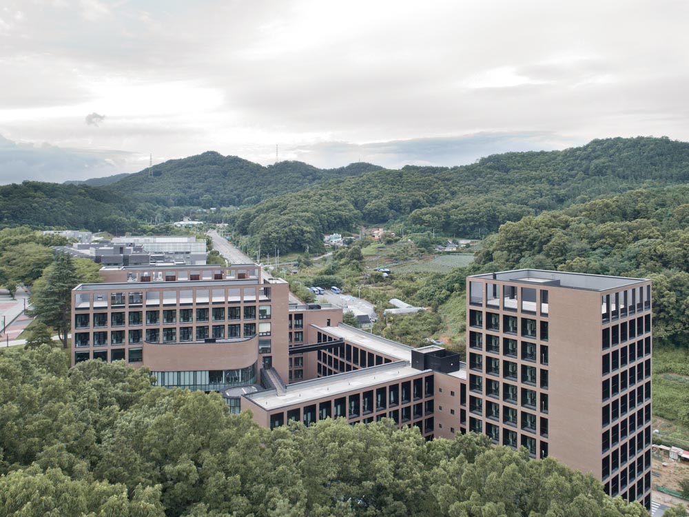 University is an academic institution pursuing universal values as the word “university” itself clearly denotes its meaning. Whole-person education is needed for this goal, and it would be achieved not by simply acquiring knowledge but by making efforts for self-development and learning from living in the real world. Under this understanding, the residential college was shaped as a very effective means. For students, coming into the residential college, even though they live there for a limited period of time, means that they cross the boundaries of the world they have lived so far. In some sense, it may mean that they renounce the worldly life and live a life of monks or nuns looking for physical, material and spiritual freedom. That’s why ‘academic monastery’ was named for this project. The monastery should have clear boundaries off from the secular world. The long wall is for such a feeling of seclusion from the outer world. Though the monastery is open to the existing campus areas, it is difficult to guess about its inside as it is not properly visible from the terrain outside of the university. The inside, however, is unexpectedly free. The residential buildings have freely-deployed shared places between them. The shared places are always very expressive of life and vigor derived from the flow of pedestrians. In the beginning of this project, ‘Academic monastery in forest’ was name of this project but the existing forest disappeared for the convenience of construction work. Newly planted trees are very young and small, but they will grow up in time. Therefore, this architecture has not been finished yet. It will be realized when the trees are well grown and the students living here become part of the landscape.