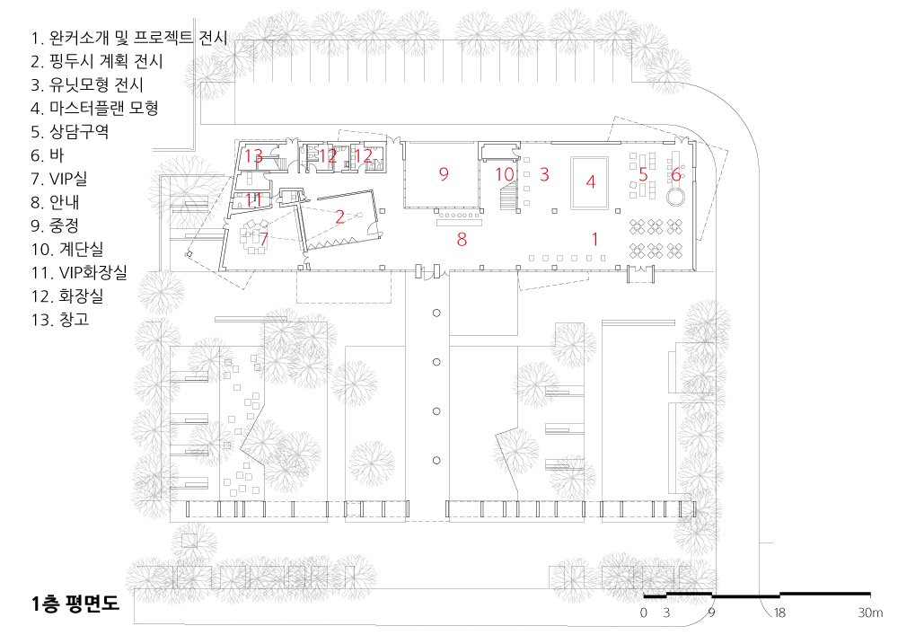 건물의 내부는 앞으로 분양할 아파트 모델하우스가 들어서게 되는데, 가상의 집인 만큼 현실의 공간과 대비되도록 축을 틀어 어긋나는 박스로 던져져 있는 형식이어서 그나마 내부공간의 흥미를 더한다. 그렇다 해도 여기서 압도적인 것은 기존의 나무들이며 지난 시대를 증언하는 가장 중요한 요소여서 그를 그대로 받았다. 이는 앞으로 새롭게 지어지는 모든 건축들을 위한 실마리가 되어야 하는 가장 중요한 원칙이어야 한다.