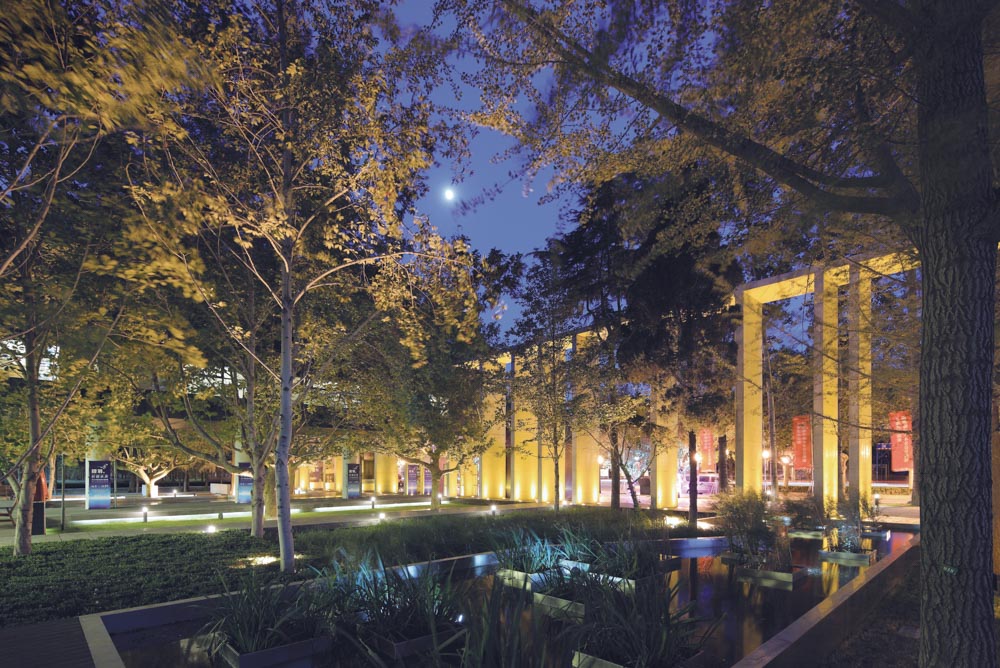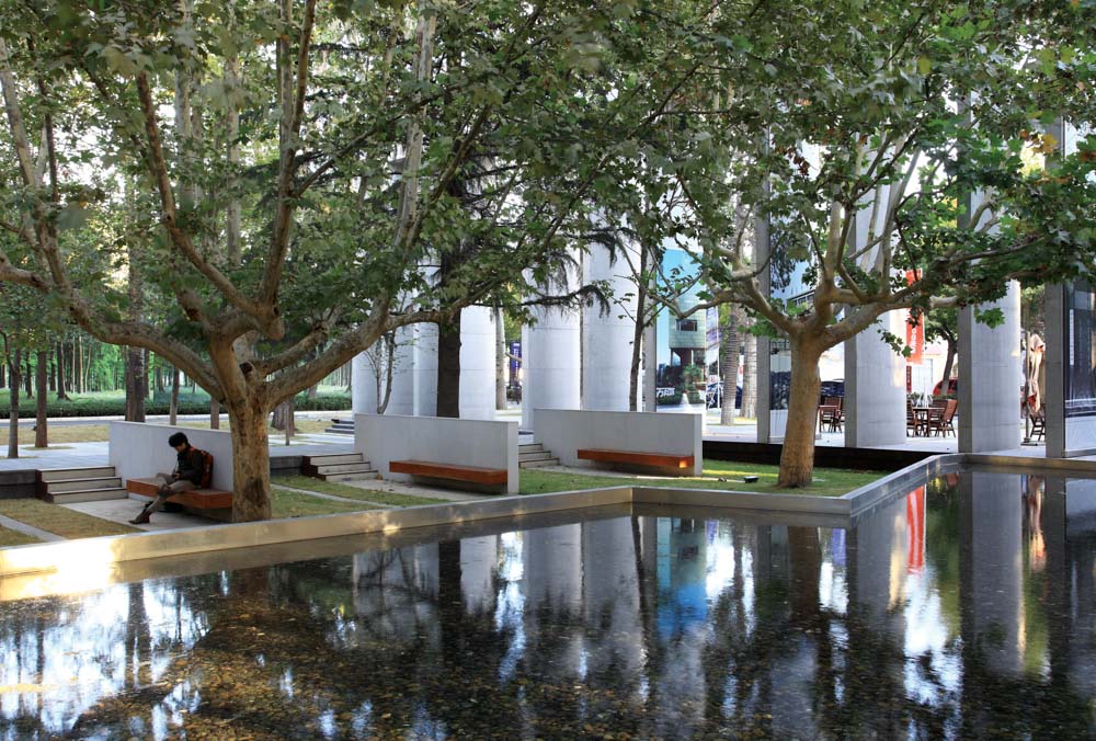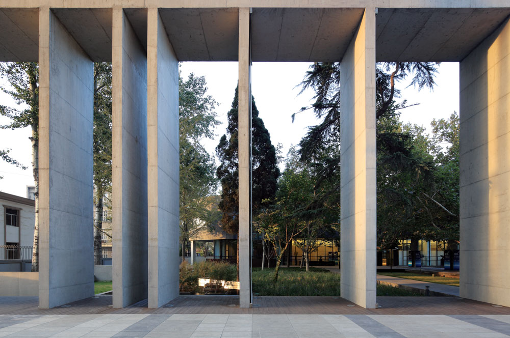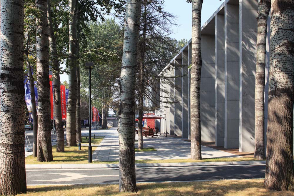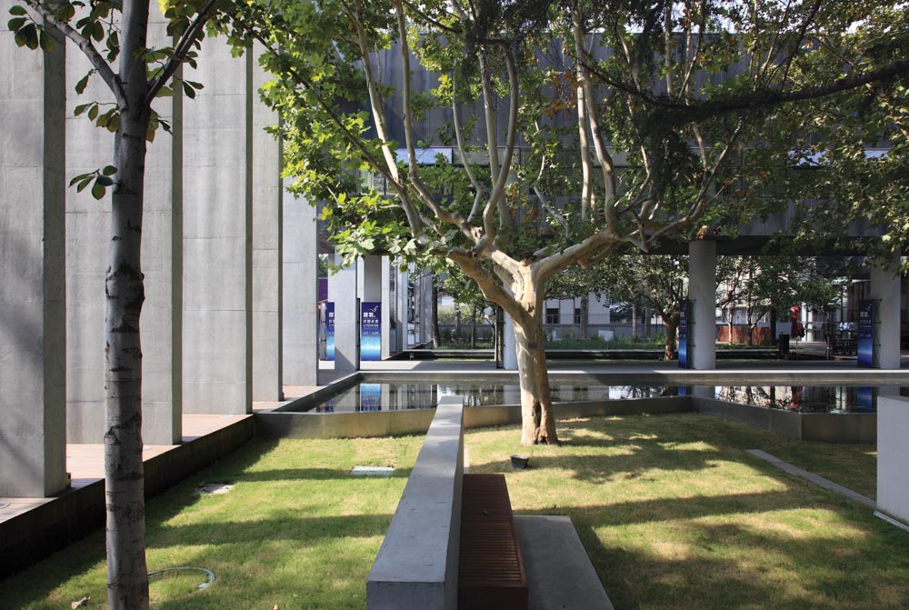 Vanke Group, a large residential real estate developer in China that took charge of the regeneration project, requested to design the first building in the plan area which would be used as the promotion hall of the whole project and a residential culture center. The site for this building was part for a small building attached to the city hall with densely populated trees. As the trees were all 200~300 years old and required to be preserved, it was mandatory for the residential culture center to build on a remaining empty land. What should be seriously considered was that this new building should be connected to the road ahead so that citizens could easily recognize it. For this, concrete frames were put up along the boundary line of the road. These concrete frames were given a function as a street gallery and designed to connect the new building deep inside the land and the gallery around the entrance to the access road. However, all these structures are merely tools that define the spatial boundaries of the beautiful trees around the building, and they do not exist in terms of architectural concept.