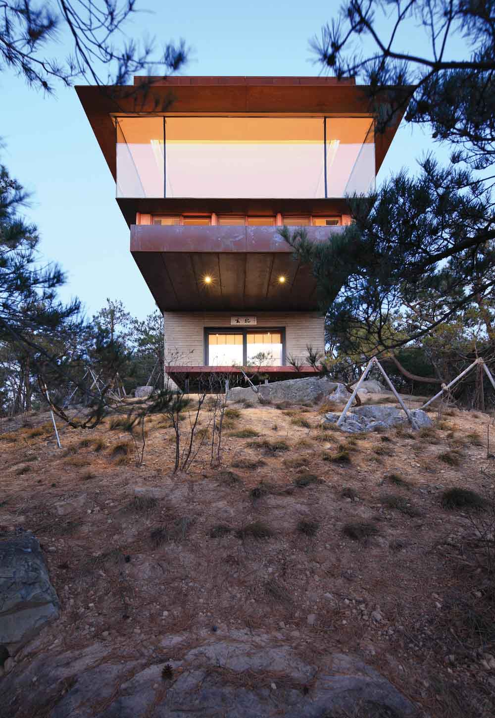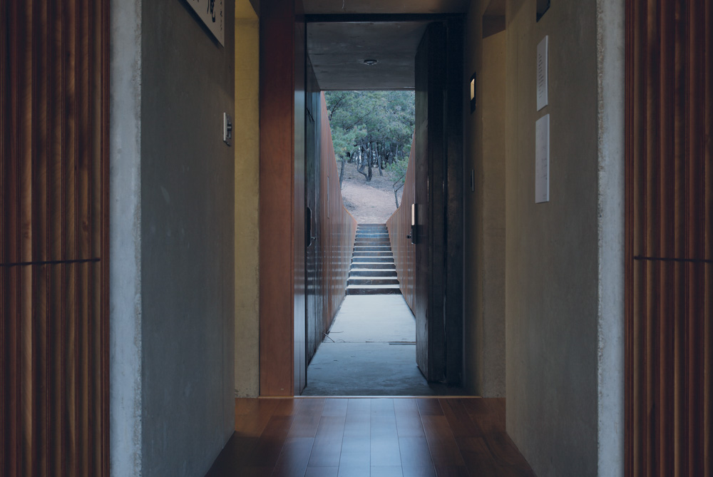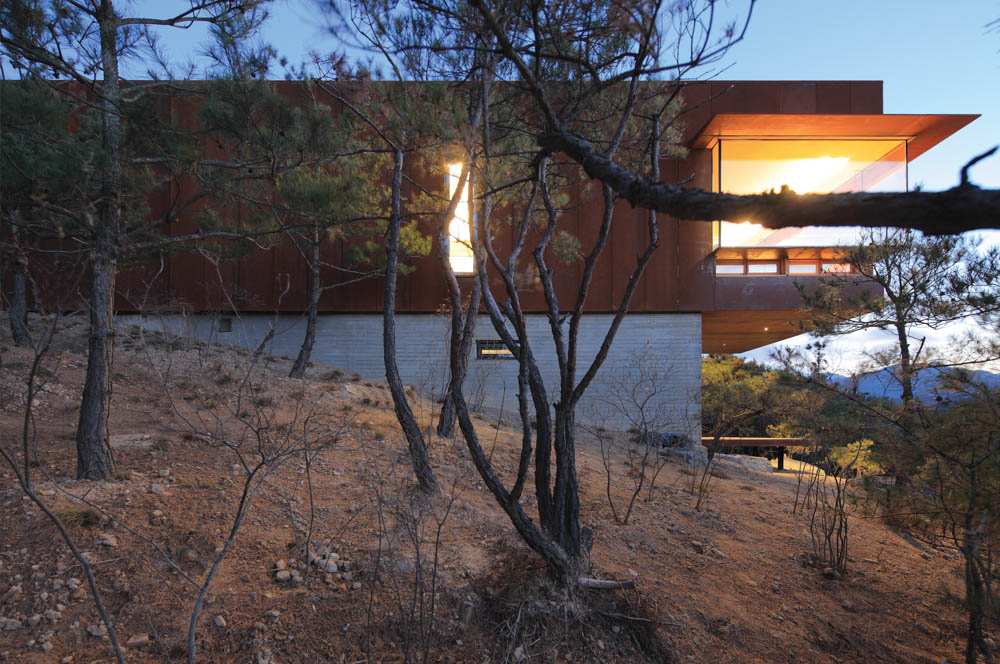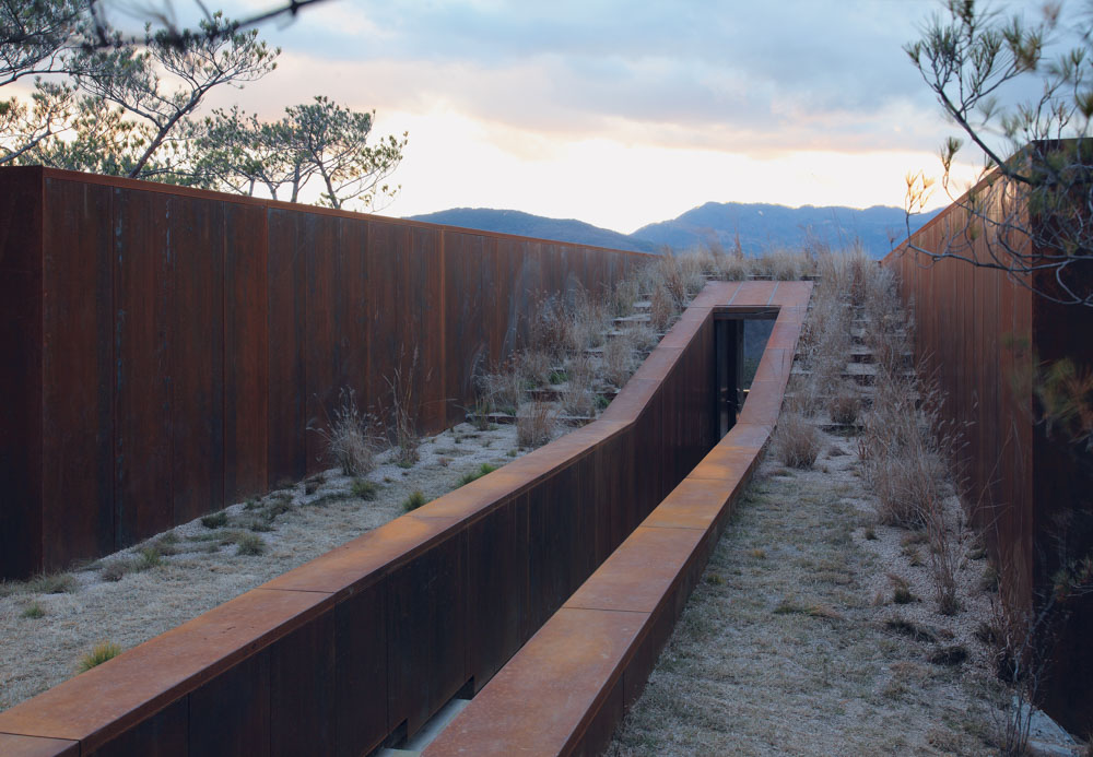 If visitors are fortunately there at sunset, they could see the beautiful glow of the setting sun. When they climb on the hill and sit down on a cold Corten steel chair in the middle of silver grass, they will feel like as part of the nature. This is a completely solitary moment, and a moment for philosophy. This is why the house was named Hyeonam, which literally means a black and shady cottage.