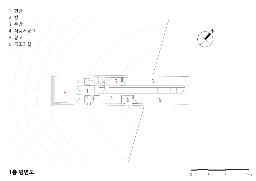 대구 시내의 모헌이라는 작은 집에서 새로운 삶의 신비를 즐겨 전하던 건축주가 군위지역에 있는 100헥타르의 산지를 수목원으로 만드는 작업에 착수했다. 오래 전부터 6백 년 수령의 모과나무들을 이식하고 간벌을 하며 자연의 변화를 관찰하더니 기거할 장소가 필요하여 아주 작은 집을 짓게 됐다. 장소는 전체 땅에서 이른바 혈에 해당하는 한복판의 요지이며 이곳에서는 산과 하늘 이외에는 아무것도 보이지 않는다. 향은 서향이어서 낙조가 건너편 저수지 너머로 떨어질 게 분명했고 지세를 따라 놓이는 집의 좌향이 겨울 무렵에는 태양의 궤적과 일치할 것이라 판단됐다.