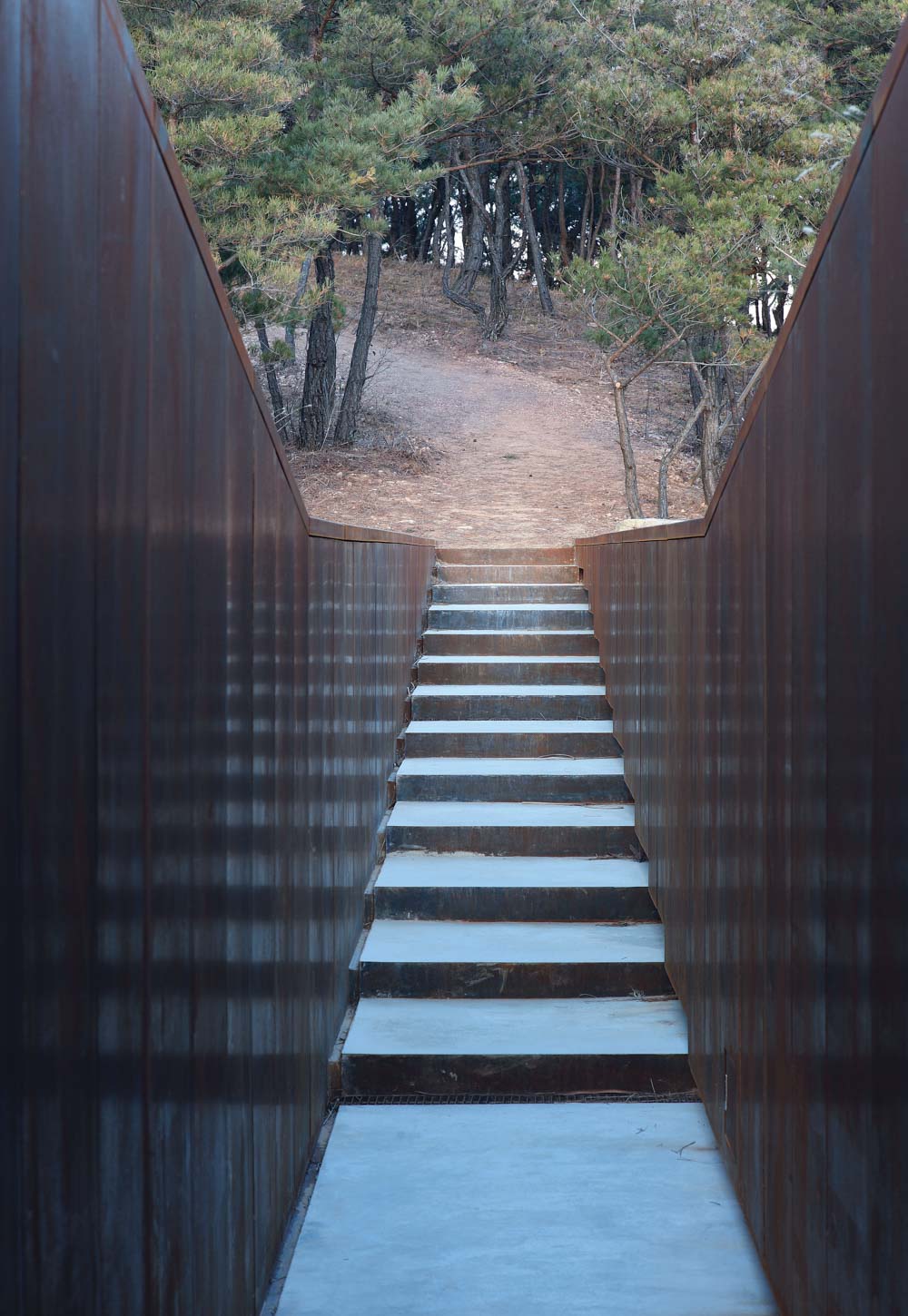 건축주는 앞으로 조성될 전체 수목원이 사유를 위한 공간이 되기를 원했다. 그래서 울창한 소나무 숲 사이 이 건축을 찾아 가는 길 주변 적절한 위치에 5개의 작은 인공 정원을 만들었다. 작은 장치지만 땅을 파낸 듯한 평면이 사유의 단초를 만든다. 이를 지나면 경사의 지면은 길다란 직선의 코르텐강의 구조물을 만난다.