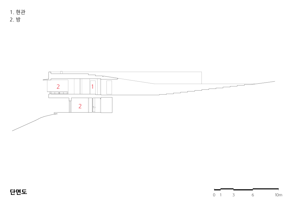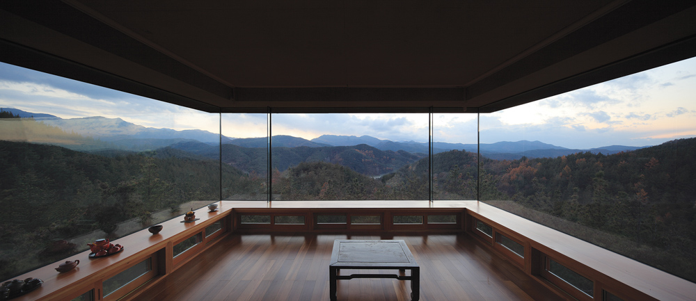 The building owner, or my client who discovered a new joy of life in a small house named Moheon that I designed in the City of Daegu, began constructing an arboretum in a 100 ha mountain area in Gunwi, Korea. While he had long transplanted 600-year-old quince trees, thinned the forest, and observed the change of the nature, he wanted to build the first house to live in there. The site is located in the middle of the mountain where people can see nothing but the rugged terrain and the sky. It faces the west, surely giving us a chance to see the sun going down over the reservoir and giving warmth in the winter season along the path of the sun.