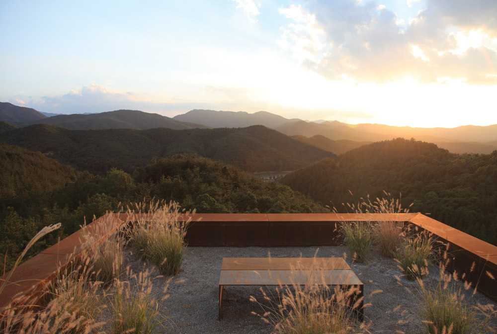 The client hoped that his future arboretum would be a place for meditation. This is why the five small artificial gardens along the access road were made, passing through the dense pine tree forest, to this cottage. While these are all small, it seems that the contrast of the slope and the flatland around each of the gardens would be a trigger for meditation. At the end of the gardens, people will see a Corten steel structure along the straight slope. Above this structure, we will see an artificial hill while seeing the valley below. Entering the structure through the door, people will find themselves overwhelmed by a deep embrace of the majestic natural landscape. No architectural concept exists there, only he or she and the nature remain in complete silence.