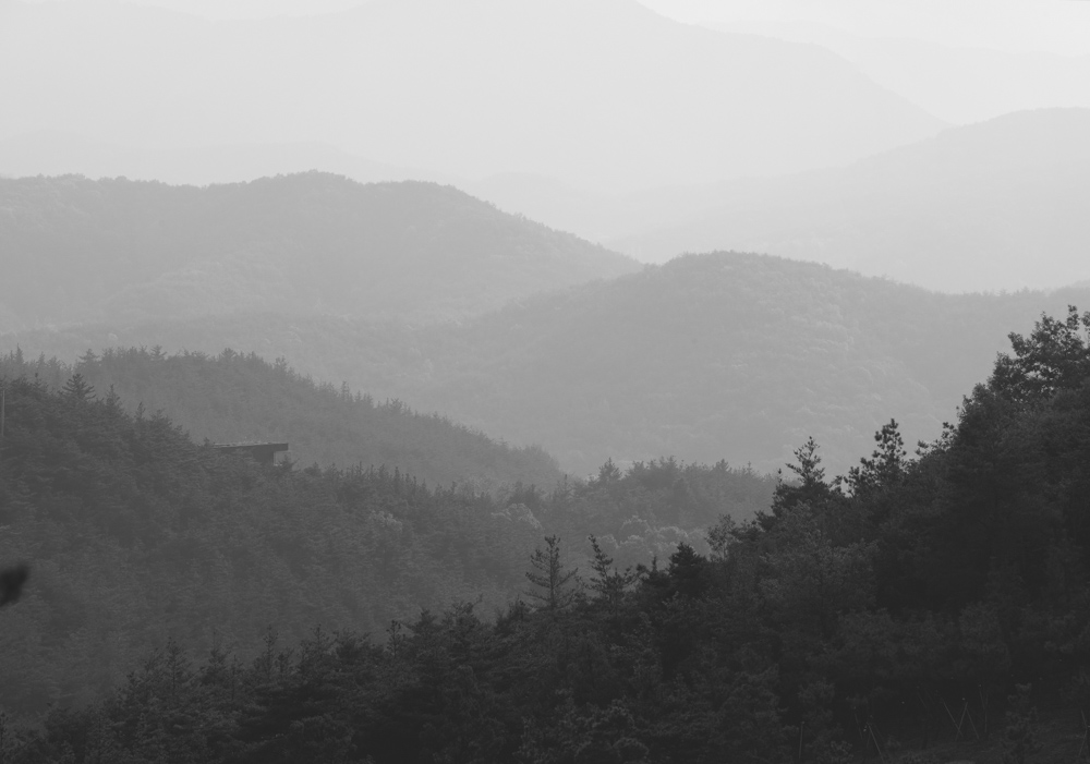 The building owner, or my client who discovered a new joy of life in a small house named Moheon that I designed in the City of Daegu, began constructing an arboretum in a 100 ha mountain area in Gunwi, Korea. While he had long transplanted 600-year-old quince trees, thinned the forest, and observed the change of the nature, he wanted to build the first house to live in there. The site is located in the middle of the mountain where people can see nothing but the rugged terrain and the sky. It faces the west, surely giving us a chance to see the sun going down over the reservoir and giving warmth in the winter season along the path of the sun.