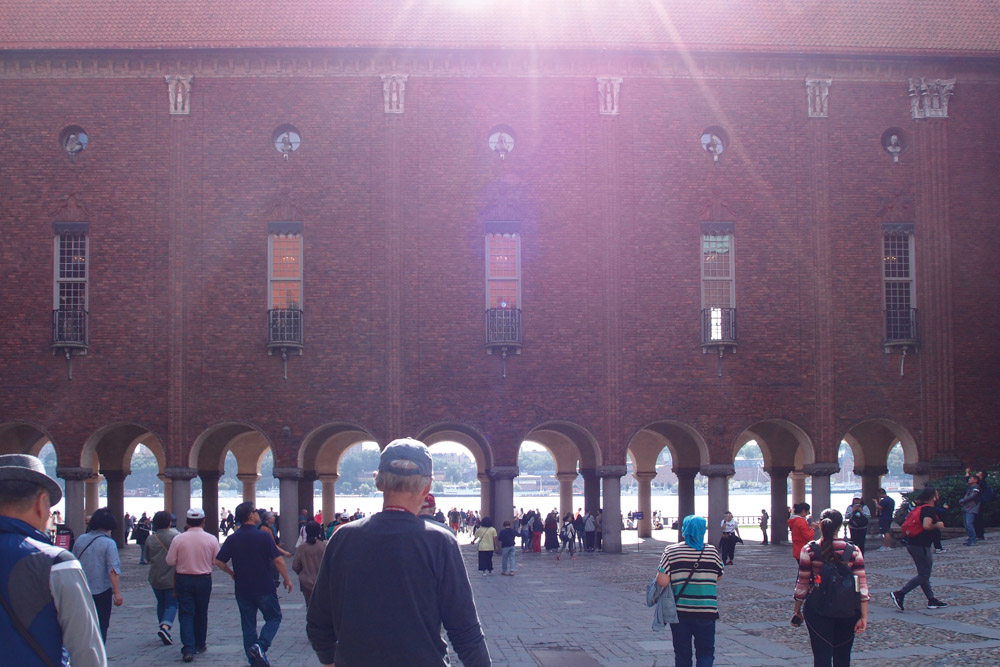 버스를 탄 채 국경선을 통과하자 수목은 울창한데(노르웨이처럼 자작나무와 소나무 등) 산이 없는 평지에 주택들 또한 노르웨이에 비해 지붕의 경사가 완만하게 자연조건을 따르고 있었다. 스웨덴은 덴마크와 동족으로 의료기기, 대체의학의 선진국이다. 해안가에 위치한 수도 스톡홀름 시청사(사진6)는 1923년에 건축되어 이곳에서 매년 12월 노벨상 시상식 및 축하연회가 열리고 있다. 연회가 열리는 황금홀은 무려 1900만 개의 금박 모자이크로 장식되어 있다. 구시가지에는 바로크와 로코코 양식이 조화를 이루고 있는 왕궁(현재 박물관)이 있고 광장주변으로 형형색색 오래된 건물과 구불구불 골목길이 이어져 있다.
