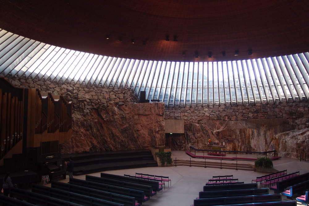 핀란드에 와서는 2군데의 건축물을 꼭 보고자 했다. 하나는 암석교회다. 이 교회의 정식 명칭은 템펠리아우키오 교회(Temppeliaukio Church)로 1969년 설계공모에 의해 티모(Timo) 와 투오모(Tuomo) 형제가 설계한 작품으로 헬싱키 중심지 바위동산의 암반을 파고 깎아서 만들었다. 루터교 교리와 핀란드 자연환경의 조화를 잘 보여주는 건축물로 구리와 자작나무를 소재로 둥근 모양의 커다란 지붕 아래 빙둘러 설치된 채광창을 통해 어둠속에서 자연스러운 빛이 유입되고 있었다. 2층 구조인데 어느 좌석에 앉든 자연스레 정면 강단과 마주하게 된다. 내부는 별다른 장식 없이 검소하고 소박하다. 설계자는 암석 자체의 아름다움을 표현하기 위해 의자도 최대한 단순하게 제작했고, 불규칙한 돌 표면이 돋보이도록 암석 외에는 교회의 흔한 장식도 모두 생략했다고 한다. 비교적 현대 건축물이지만 ‘죽기 전에 꼭 봐야할 세계 건축물’ 중 하나로 손꼽히며 신도가 아니어도 전 세계에서 수많은 관광객이 찾는다. (사진8)