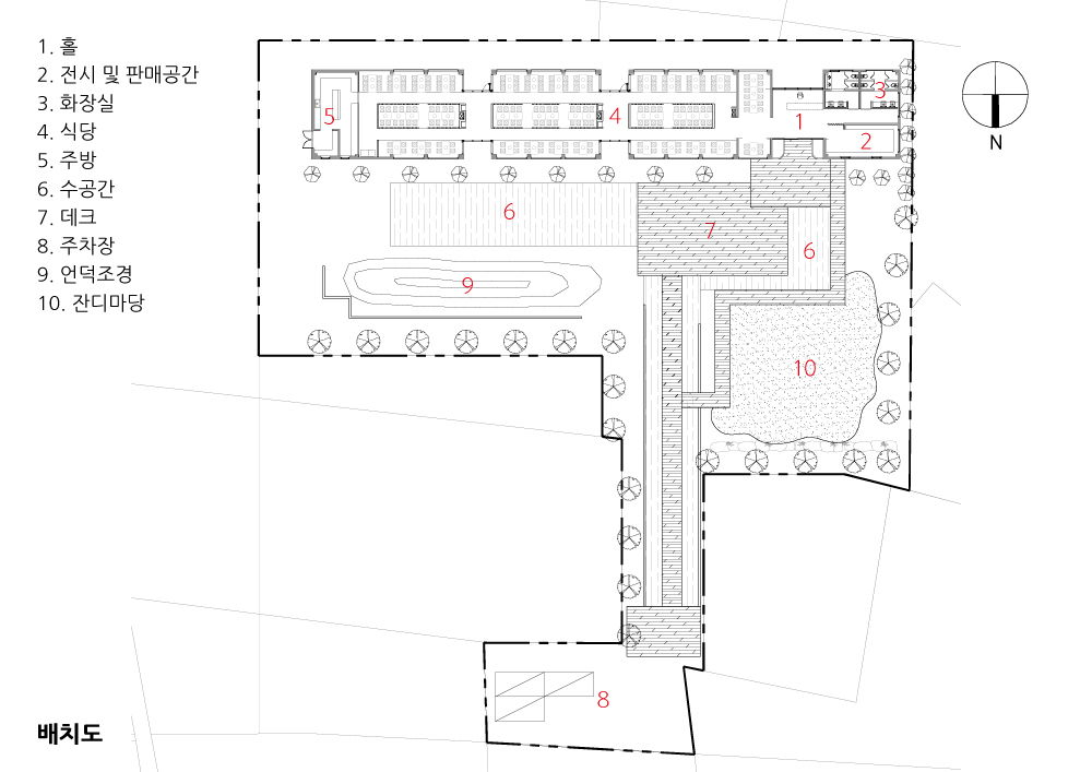 The client wanted to design a restaurant with a different concept from typical spicy stir-fried chicken restaurants in Cheonjeon-ri, Sinbuk-eup where similar restaurants and cafes are located in the lower part of Soyang Dam. The building is designed to be simple and clear for a better understanding of space and to relieve monotony by giving variety to landscaping and interior design.