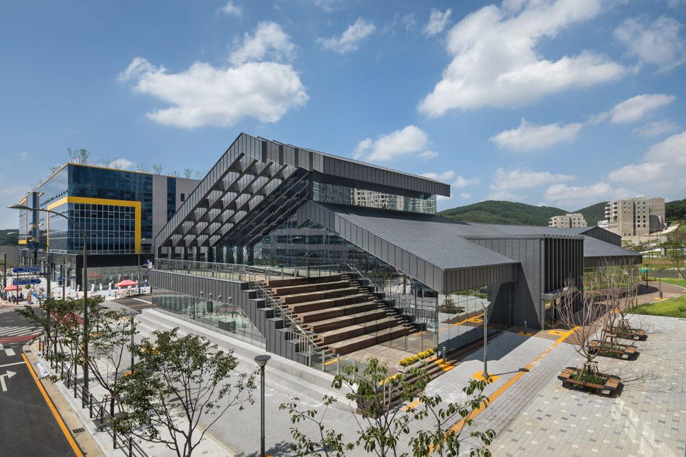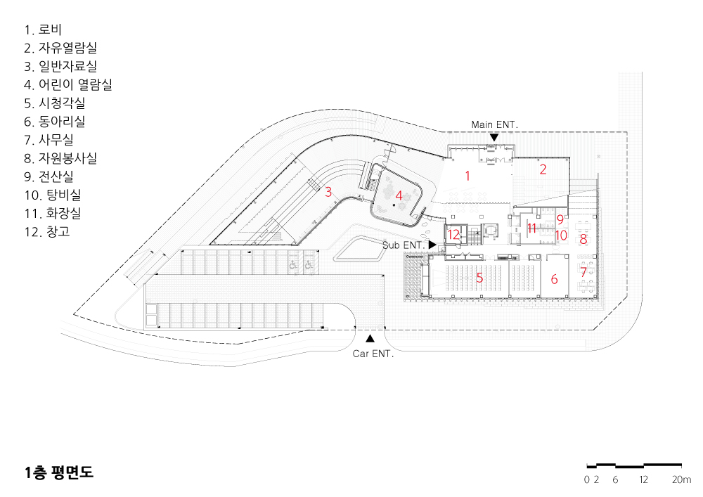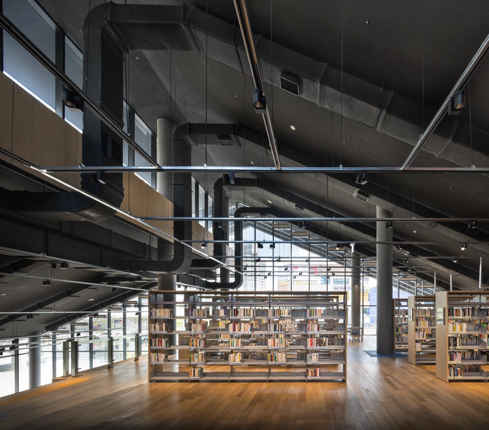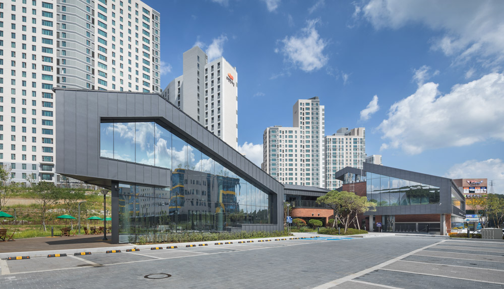 It will be located in the library park among six theme parks of the entire complexes, and high-corrosion resisting steel plates(color steel sheet) and bricks were used as exterior materials. To give the comfort of a house, we began with the concept of a typical gable roof and eventually devised the concept of space where the cross-sections of various activities in a library are stacked horizontally and integrated into one space.