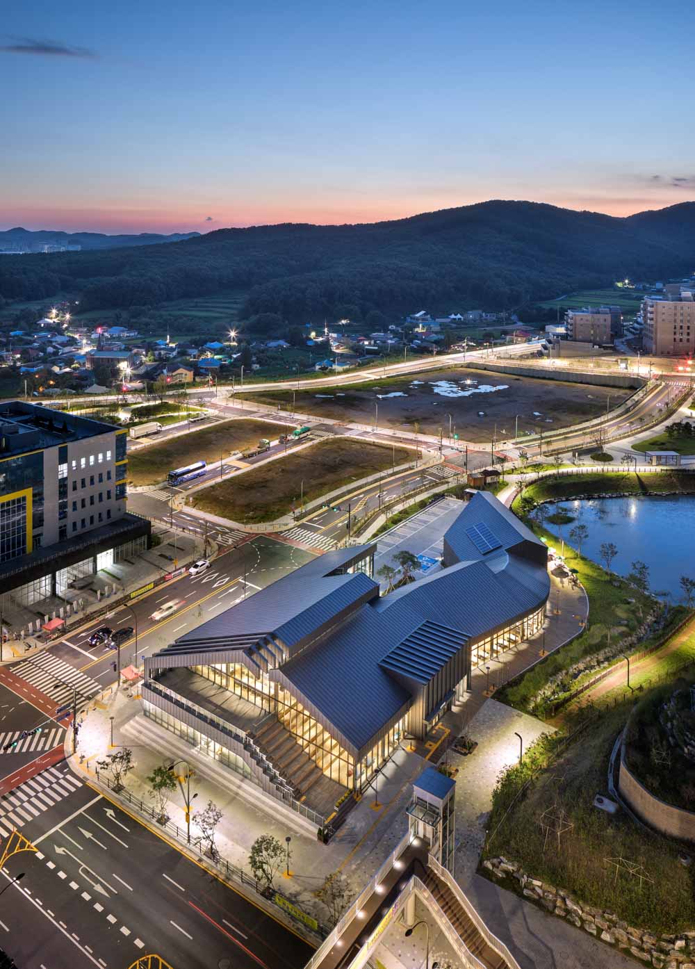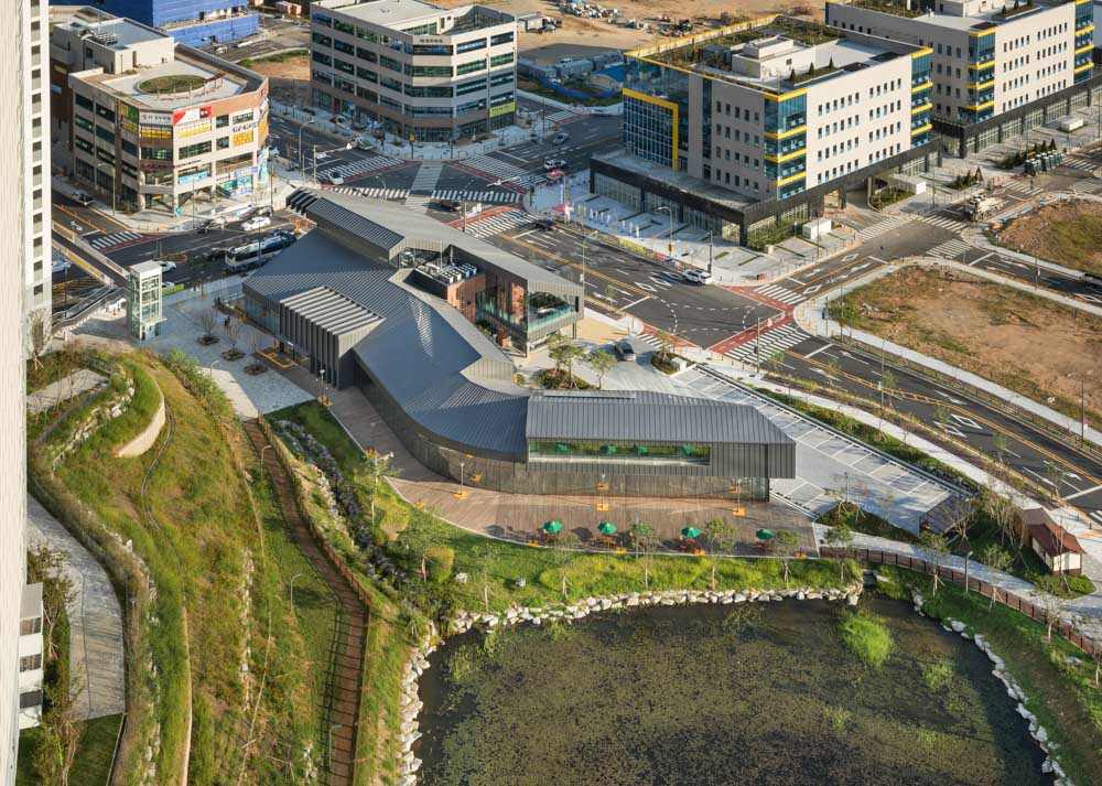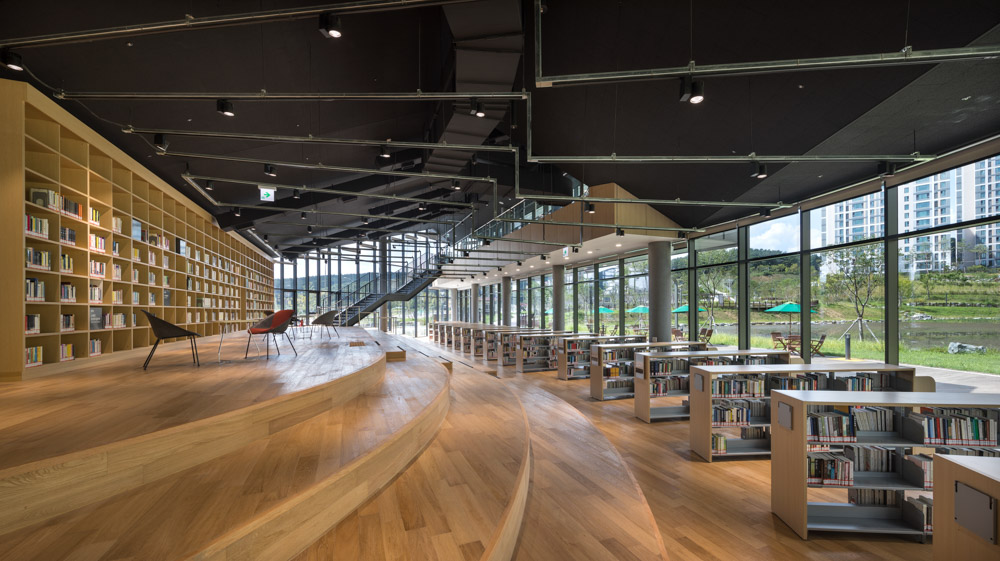 산책로와 연계해 프로그램을 선형으로 배치하고 학습, 열람, 휴게 등 필요한 공간 형태를 단면으로 구성해 중첩시켜 하나의 유연한 공간으로 만들었다. 이를 통해 내·외부 공간의 시각적 연계와 다양한 공간감은 기존 도서관과 달리 공원 속 수변과 어우러져 카페처럼 편한 휴게 공간, 자유롭게 책을 보는 서점, 학생들이 공부하는 독서실, 취미를 배우는 문화센터 등과 같이 다양한 모습을 담아 주민의 소통과 교류의 장소가 되도록 계획했다.