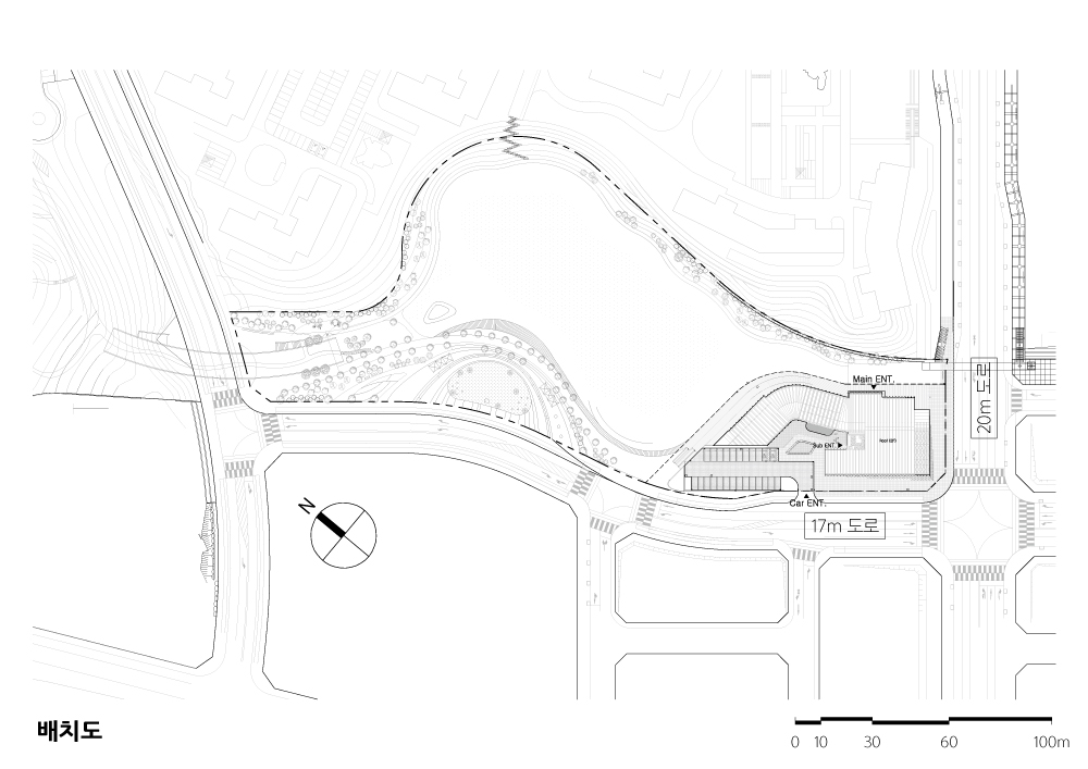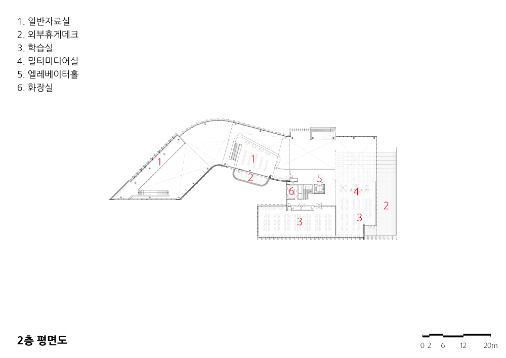 Programs were placed along with trails, and the necessary spaces such as learning, reading, and rest were organized in cross-sections to form a flexible space. Through this, the visual connection between indoor and outdoor spaces and various senses of space were designed to harmonize with the waterfront in the park, unlike existing libraries so that it can be a place of communication and exchange among residents since it plays multiple roles as a resting place like a cafe, a library to freely read books, a study room for students, and a cultural center to learn hobbies.