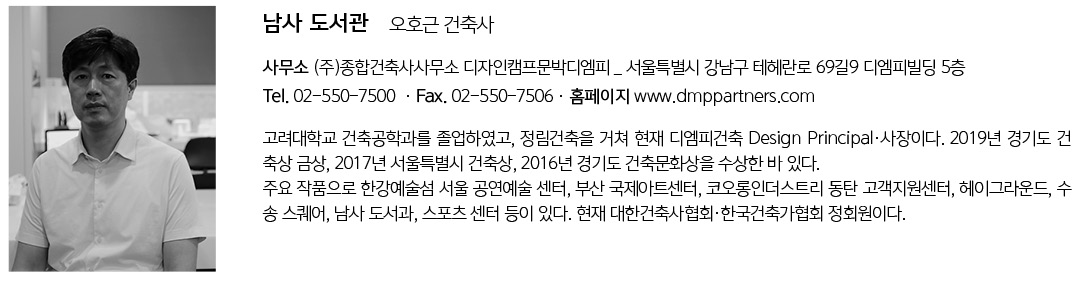 | 남사 도서관 설계자 | 오호근_(주)종합건축사사무소 디자인캠프문박디엠피 건축주 | 동우개발(주) 시공사 | 대림산업(주) 설계팀 | 이영명, 정지훈, 전은수, 이시헌, 이재홍, 정태권, 백경철 대지위치 | 경기도 용인시 처인구 남사면 한숲로 61 주요용도 | 교육연구시설(도서관) 대지면적 | 20,325㎡ 건축면적 | 1,665.32㎡ 연면적 | 3,400.08㎡ 건폐율 | 8.19% 용적률 | 12.07% 규모 | 지하1층, 지상2층 구조 | 철골조, 철근콘크리트조 외부마감재 | THK28 로이복층유리, 컬러벽돌, 고내식성 강판 내부마감재 | 우드플로어링, 컬러벽돌, 수성페인트, 우드시트 설계기간 | 2015. 07. ~ 2016. 12 공사기간 | 2017. 03. ~ 2018. 06. 사진 | 윤준환 전문기술협력 - 구조분야 : (주)센구조연구소 - 기계설비분야 : (주)씨엔아이엔지니어링 - 전기분야 : (주)명인에스아이엔지니어링 - 조경분야 : (주)좋은이엔지 |