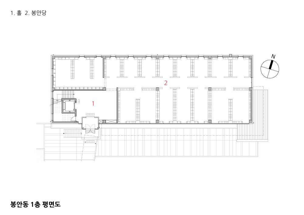 산자락의 중턱에 위치한 사이트는 남동쪽으로 열려 있다. 자연과 어우러진 배치를 위하여 사무동과 봉안동을 ‘ㄱ’ 자로 배치하고 건물을 최대한 북서쪽으로 밀어올렸다(배치도 참조). 사무동에는 사무실은 물론 유족을 위한 휴게실, 기도실, 화장실 등이 위치해 있으며, 봉안당을 오가며 언제든 이용이 편리하도록 배치했다. 특히 화장실은 실내가 아닌 실외에서 바로 이용가능하도록 하여 유지관리의 편의성을 도모했다. 휴게실은 사무동과 봉안동 사이의 중정을 조망하는 위치에 두어 정적인 느낌을 강조했다. 사무동의 좌측은 건물의 가벽을 연장하고 작은 마당을 추가하면서 겹겹의 시각적 레이어를 형성했다. 이는 진입마당에서 사무동의 측면이 보이는 단점을 극복해주었다.