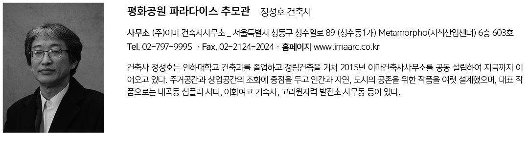 | 평화공원 파라다이스 추모관 설계자 | 천서봉 · 정성호_(주)이마 건축사사무소 건축주 | (재)평화공원 감리자 | (주)이마 건축사사무소 시공사 | 일산종합건설(주) 설계팀 | 임병덕, 최영태, 김동현 대지위치 | 충청남도 금산군 복수면 앞재길 21-48 주요용도 | 봉안당 대지면적 | 9,918.00㎡ 건축면적 | 861.21㎡ 연면적 | 1,443.62㎡ 건폐율 | 8.68% 용적률 | 14.56% 규모 | 관리동 지상 2층 · 봉안동 지상 2층 · 제례실 지상 1층 · 회랑 구조 | 철근콘크리트 외부마감재 | 관리동 - 와이드 벽돌(베이비 블랙 와이드390):더 올포엠 봉안동·제례실 - 대리석(머쉬룸 크림), 화강석(마천석) 내부마감재 | 포세린 타일 설계기간 | 2018. 05 ~ 2018. 08 공사기간 | 2019. 03 ~ 2019. 10 사진 | 김홍기 _ [주]문 전문기술협력 - 구조분야 : (주)지오엔지니어링 - 기계설비분야 : 청훈이엔지(주) - 전기분야 : (주)시엔에스엔지니어링 - 소방분야 : (주)반석이레기술단 |