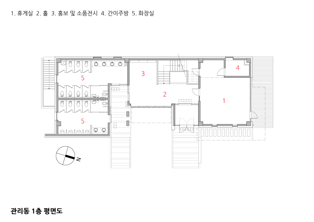 The site on the hillside is open to the southeast. An office building and a charnel house building are placed in the layout of 'L'-shape, and the buildings are pushed up northwestward as much as possible(See a plot plan). The office building has not only an office but also a lounge, a chapel, and a restroom for the family of the deceased, which is placed for them to conveniently come and go to and from the charnel house at any time. In particular, the restroom can be used immediately outdoors, not indoors, for easier maintenance. The lounge is placed to have a view of the courtyard between the office building and the charnel house building, thereby showing a very static feeling. The left side of the office building forms multiple visual layers as the fake walls of the building are extended and a small courtyard is added. This overcomes the shortcomings that the side of the office building is seen from the entrance yard.