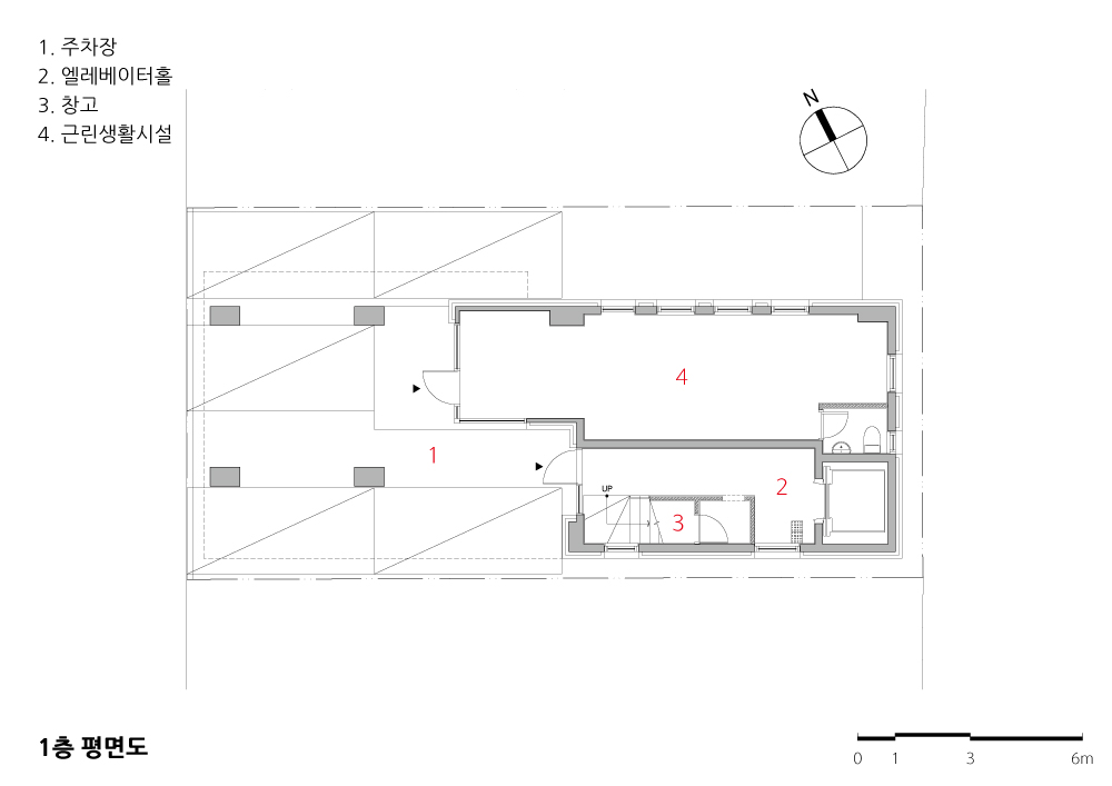 This building consists of a mall on the first floor, houses on the second and third floors, and IUM ARCHITECTURE's duplex office on the fourth and fifth floors. We tried to give individuality to the houses through different finishing and window design for each house so that they could not have a uniform house appearance. In the early stage of design, we also considered finishing exterior walls with exposed concrete, but this has the disadvantage of poor insulation. So the outside fake walls and terraces, irrelevant to insulation, are finished with exposed concrete, whereas the rest of the outer walls are finished with concrete bricks for outside insulation. For the indoor concrete structure walls and slabs, we used the frames from the structure itself as a major interior element. The inclined plane in the duplex on the 4th and 5th floors was used as a vertical interior element of indoor space in connection with open space. On the southwest side of a narrow and long office, we installed windows as many as possible so that it is not too confined and have natural light even in the narrow office space. The southwest side is designed to have a clerestory to control solar heat to utilize it in winter and block it in summer. The solar heat received during the daytime in winter can be saved in indoor slant concrete walls while radiant heat is emitted at night, which reduces the heating load. Sunlight receives scattered light all year round to allow natural light. Especially, the light incoming through the clerestory flows into the 5th-floor toilet, creating a bright indoor atmosphere. Besides, it has a passive natural ventilation system where fresh air from the windows installed on the lower wall of the fourth-floor terrace flows into the corresponding floor and the fifth floor, and then it is emitted through a clerestory.