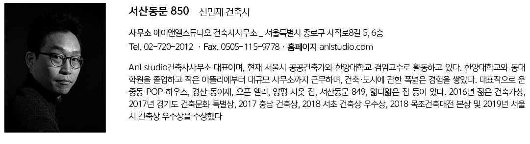 | 서산동문 850 설계자 | 신민재 + 안기현_에이앤엘스튜디오 건축사사무소 + 한양대학교 건축주 | 김효원 감리자 | 안희찬 시공사 | 김효원 설계팀 | 최성식, 권효윤, 박형국 대지위치 | 충청남도 서산시 탑동2로 10-3 주요용도 | 단독주택 대지면적 | 210.00㎡ 건축면적 | 102.15㎡ 연면적 | 200.97㎡ 건폐율 | 48.64% 용적률 | 95.70% 규모 | 지상 3층 구조 | 철근콘크리트조 외부마감재 | 석재 내부마감재 | 석고보드 위 도장, 칼라MDF, 적삼목사이딩 설계기간 | 2016. 02. ~ 2017. 04. 공사기간 | 2017. 04. ~ 2018. 01 사진 | 신경섭 전문기술협력 - 구조분야 : 다우구조 - 기계설비분야 : 정연 ENG. - 전기분야 : 정연 ENG. - 소방분야 : 정연 ENG. |
