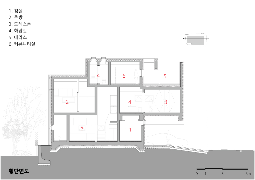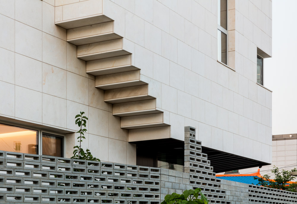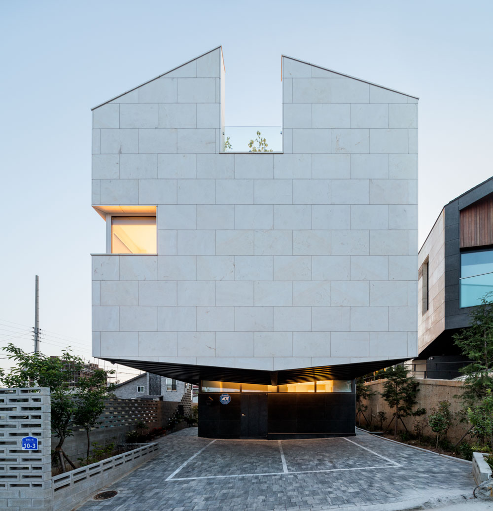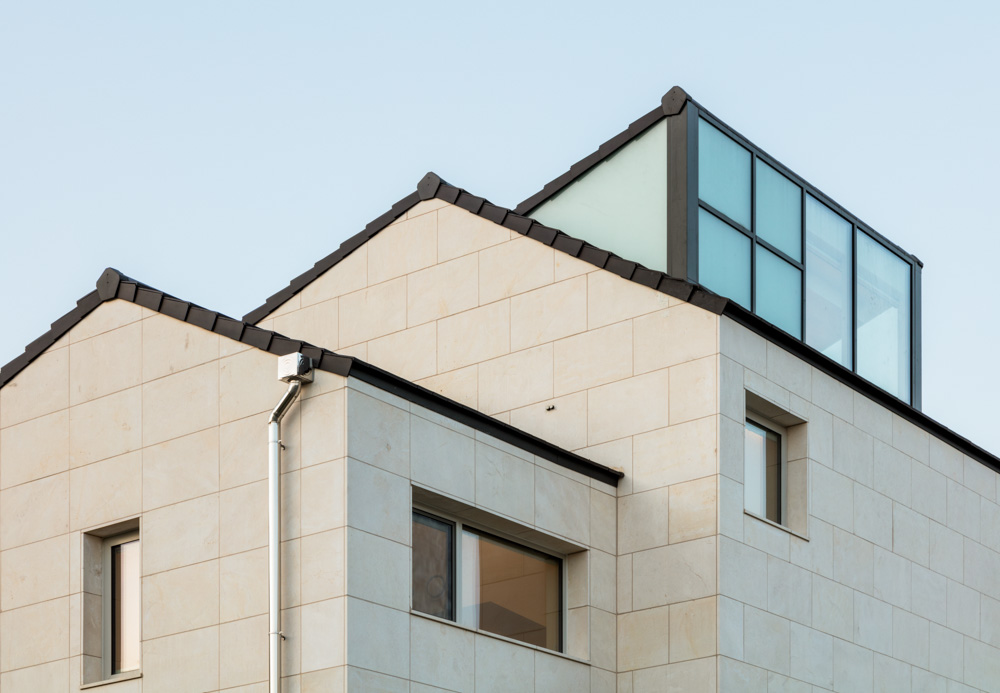 Setting up a new building in an old residential context should be conscious of its surroundings. Considering with cultural heritage near site area, we try to avoid noticeable form and colors and design with a gentle stone finish, so that we can achieve the fits with context. As a result, we plan to avoid visible form and colors and design with gable shapes and warm-colored texture. On the other hand. the facade was emphasized in the form with cantilevered mass as well as the shape of the parapet. These are our goal to satisfy with harmonizing with context as well as exposing their individualities without conflict each other as a single family.