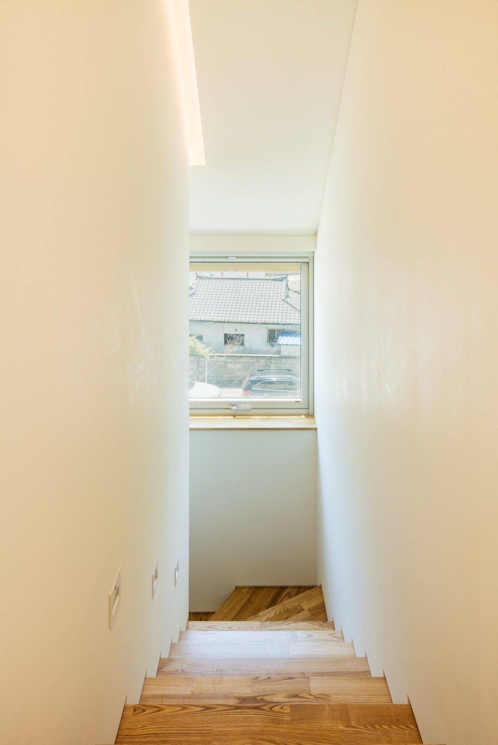 기존 주택지의 좁은 골목 안에 건물을 신축하는 것은 신경이 많이 쓰인다. 서산 동문동은 고려시대 석탑이 있을 정도로 오랜 역사를 갖고 있는 주거지다. 그래서 새로 조성된 택지나 전원에 나 홀로 지어지는 주택을 계획할 때와는 태도가 달라야 했다. 눈에 띄는 조형이나 색채를 지양하고자 안정감 있는 박공 형태를 제안하고, 부드러운 색상과 질감의 석재로 마감 계획을 했다. 한편으로 외부공간에 기둥 없이 올려둔 매스와 옥상 난간 벽의 형태로 입면을 강조했다. 단독주택으로서 필요한 개성을 찾으면서도 주변과 조화를 이루고자 고민한 계획이다.