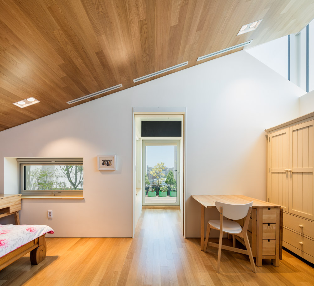 The exterior space facing the alley was planned as an open space without a fence or gate. The cantilevered massing sets up its territory in the outer space in a narrow alleyway. Although the required parking space were arranged, the materials on the ground is planned for outdoor activities and pedestrians's comfortable walking, so that they could be used with neighbors as needed.