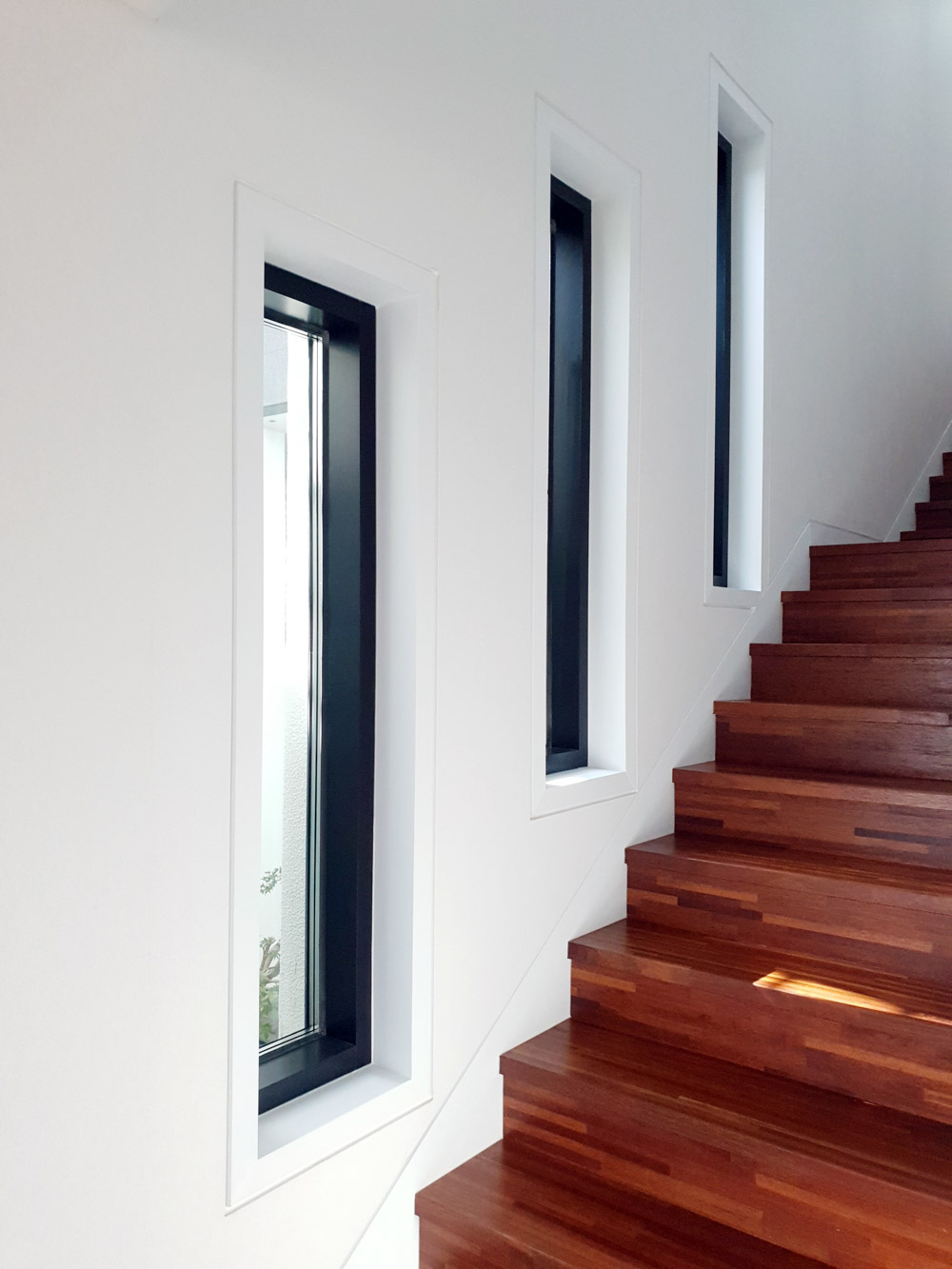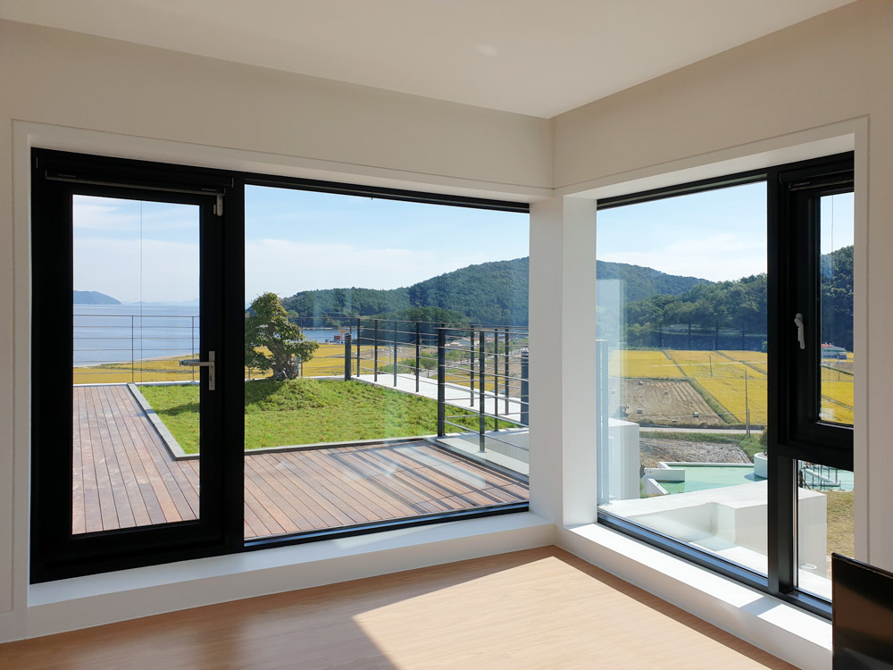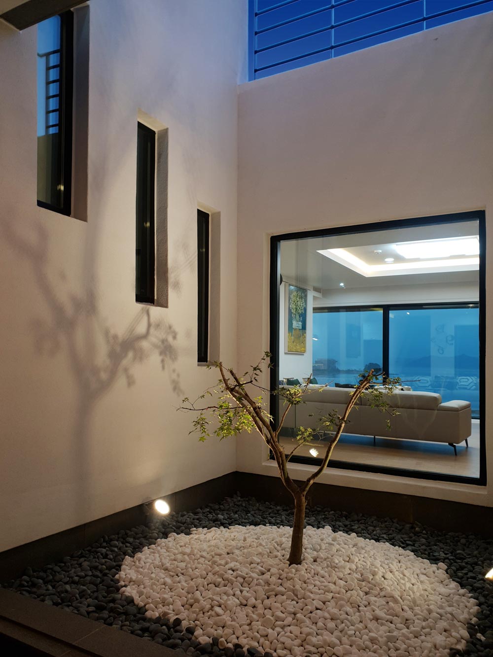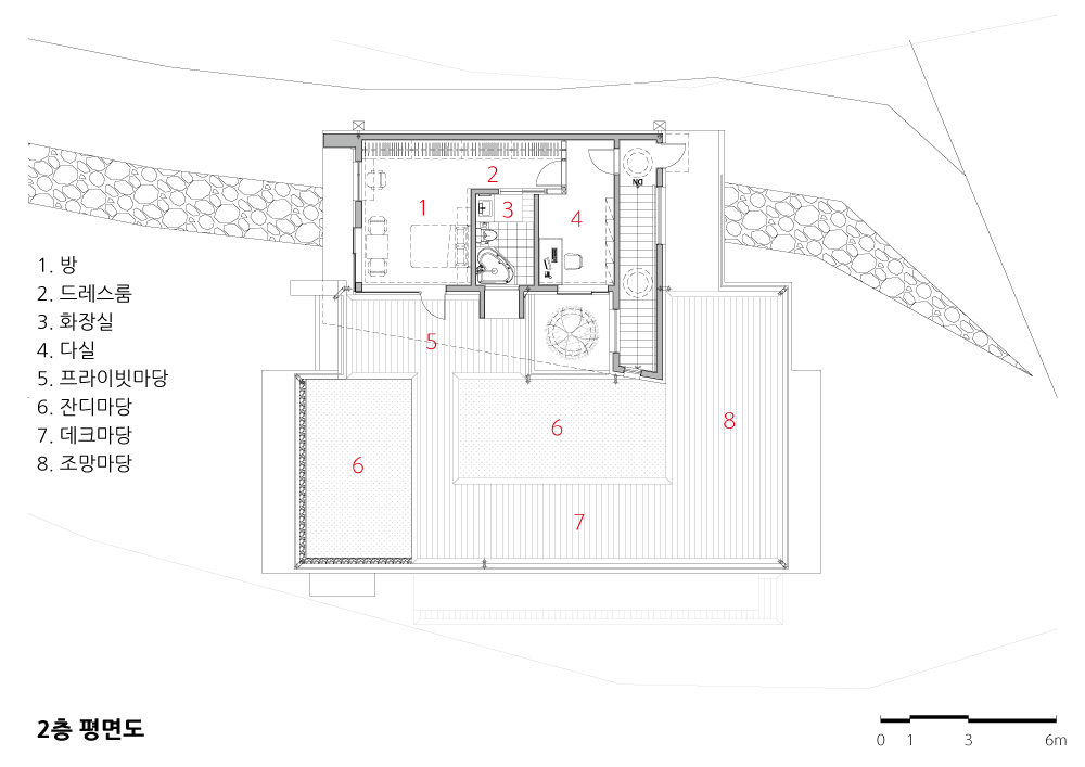 평면은, 부지의 형상과 주변 환경 그리고 전망을 고려해 외부지향형으로 하고 실내중정으로 빛과 홍단풍의 자연을 들인다. 거실과 다이닝룸의 공용공간은, 전망 좋은 동쪽의 바다와 들판으로 향하고, 1층과 2층의 방들은 남향이다. 서쪽으론 개구부가 없고, 북쪽으론 계단과 다용도실 등의 공용공간을 배치해 에너지 절감을 고려했다. 2층으로 오르는 직통계단 천장엔 원형천창을 설치해 밤으론 별빛을, 낮으론 자연채광을 선물한다.