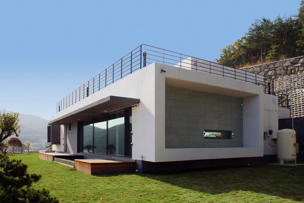 배치는, 부지 폭이 좁은 계단식으로 개발된 택지에 순응하게끔 1층은 하단부에 2층은 상단부에 계단식으로 걸쳐 집을 앉힌다. 1층 거실 앞의 다소부족한 마당은, 1층 옥상을 이용한 데크마당의 확보로 전망 감상에 모자람이 없다. 열린 바다와 들판이 내 앞마당이 된다. 이 1층 옥상마당엔 잔디를 식재하고 목재데크를 설치해 친환경적이며 에너지 절감 효과도 있다.