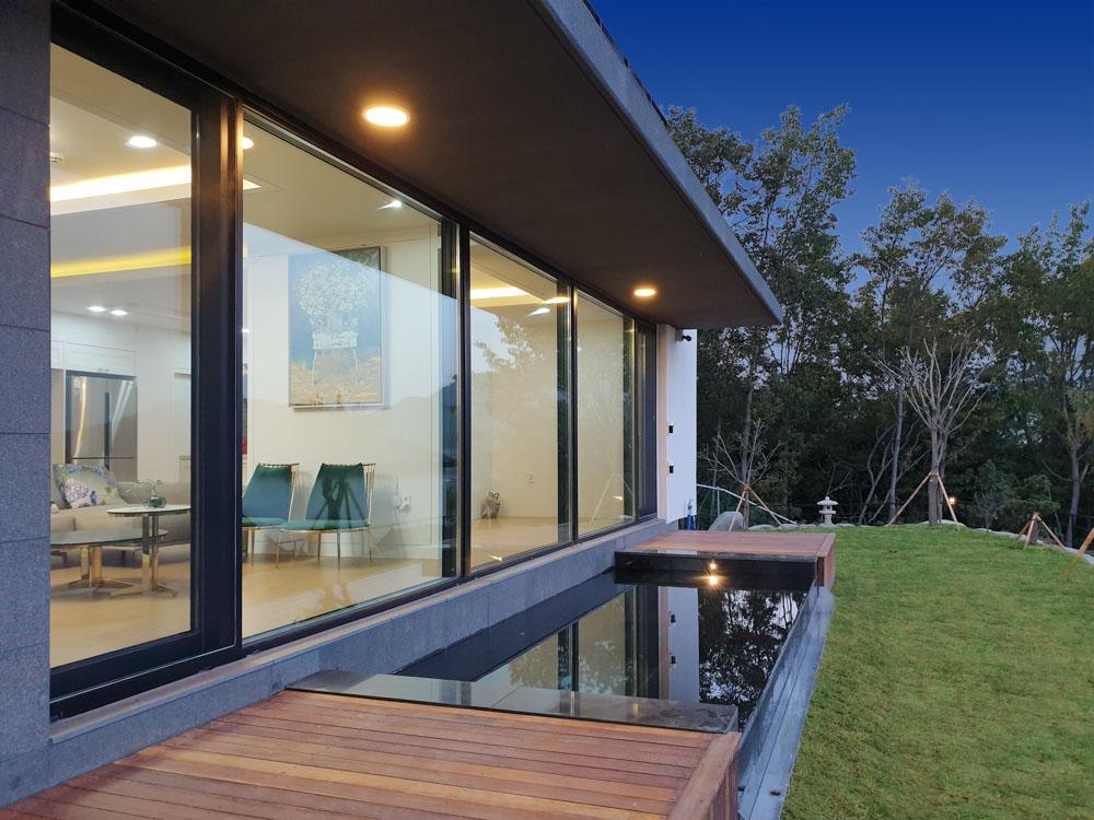 거실 앞 연못의 친수공간은, 정서적 안정과 함께 여름철 지열을 식혀줄 장치다. 잔잔하던 물위로 바람이 찾아드니 작은 물결이 인다. 마치 평온하던 마음에 걱정꺼리가 생기니 마음이 흔들리는 것과 같이... 자연에서 지혜를 배운다.